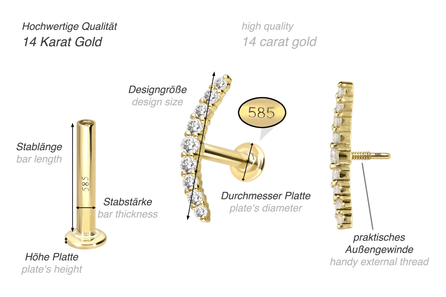 Dieses Labret ist mit Ausnahme der Moissanite vollständig aus hochwertigem 14 Karat (585er) Gold gefertigt, das neben seiner exzellenten Qualität auch mit Eigenschaften wie guter Hautverträglichkeit und hoher Beständigkeit zu begeistern weiß. Farblich ist es in Gelbgold, Roségold und rhodiniertem Weißgold erhältlich. Das Labret verfügt über einen zeitlos schönen Schraubaufsatz mit Außengewinde in Form eines Bogens, hat