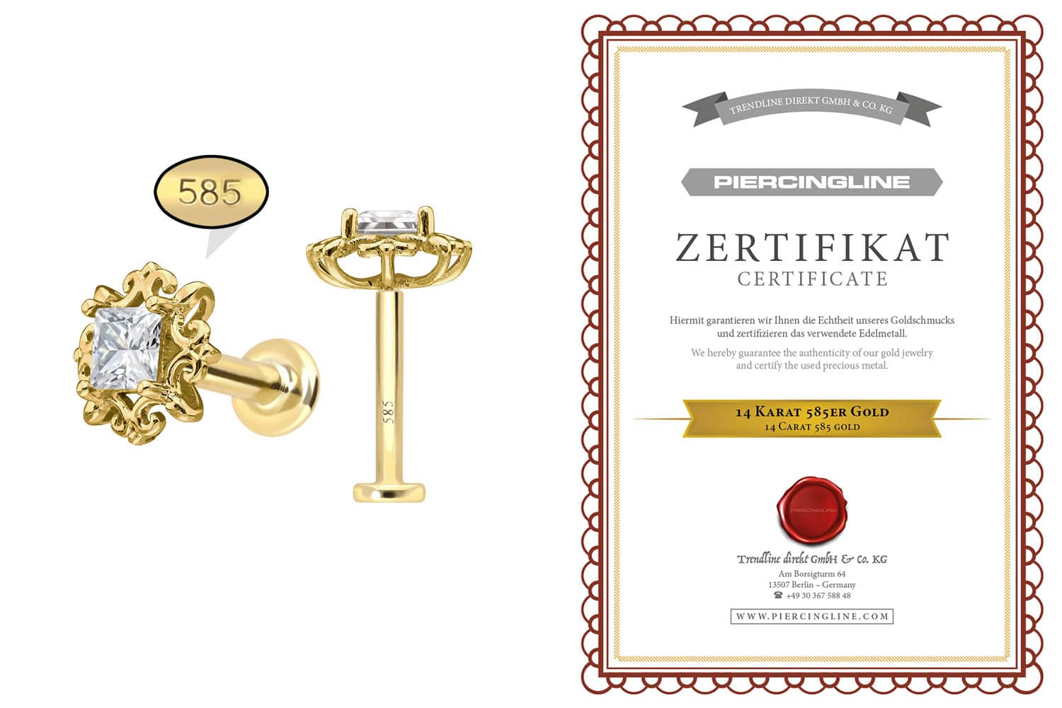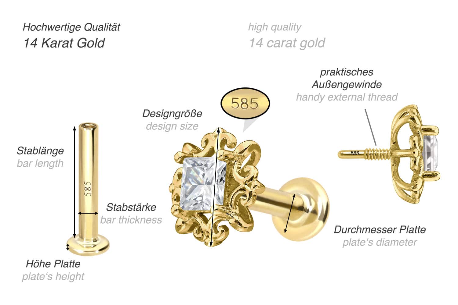 14 Karat Gold - Labret mit Innengewinde Moissanit-Quadrat + Ornamente