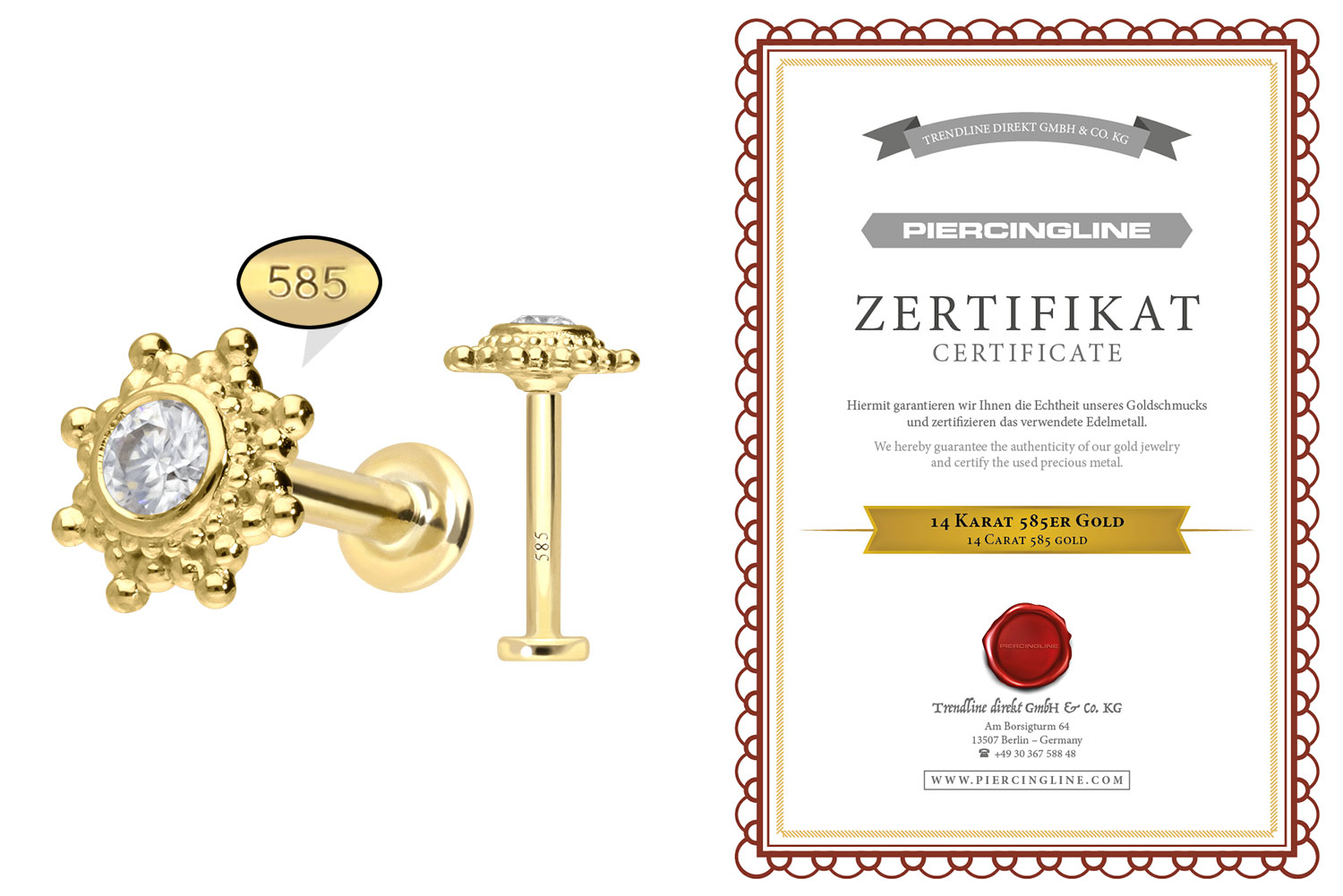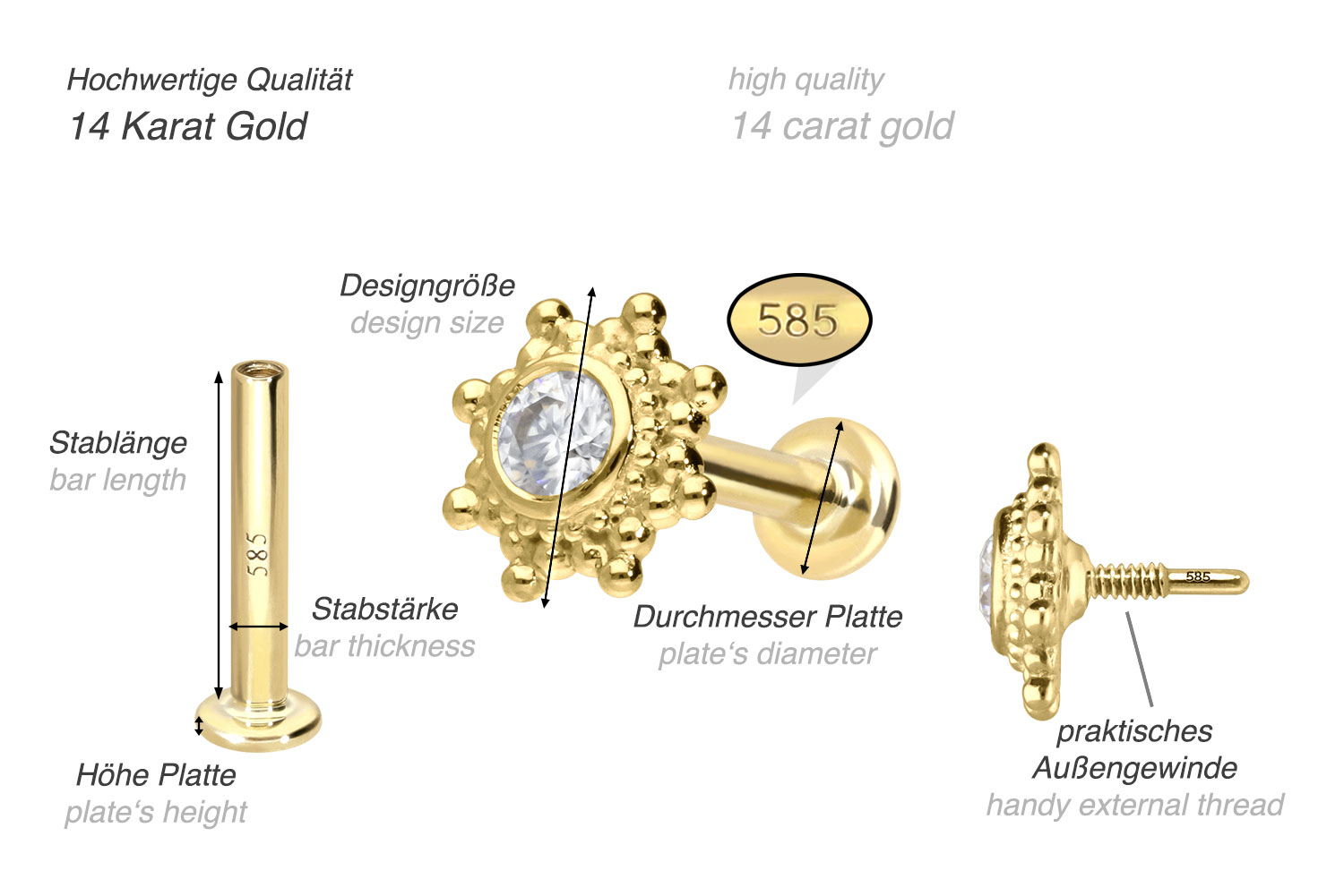 Dieses Labret ist mit Ausnahme der Moissanite vollständig aus hochwertigem 14 Karat (585er) Gold gefertigt, das neben seiner exzellenten Qualität auch mit Eigenschaften wie guter Hautverträglichkeit und hoher Beständigkeit zu begeistern weiß. Farblich ist es in Gelbgold, Roségold und rhodiniertem Weißgold erhältlich. Das Labret verfügt über einen zeitlos schönen Schraubaufsatz mit Außengewinde in Form einer Sonne, hat