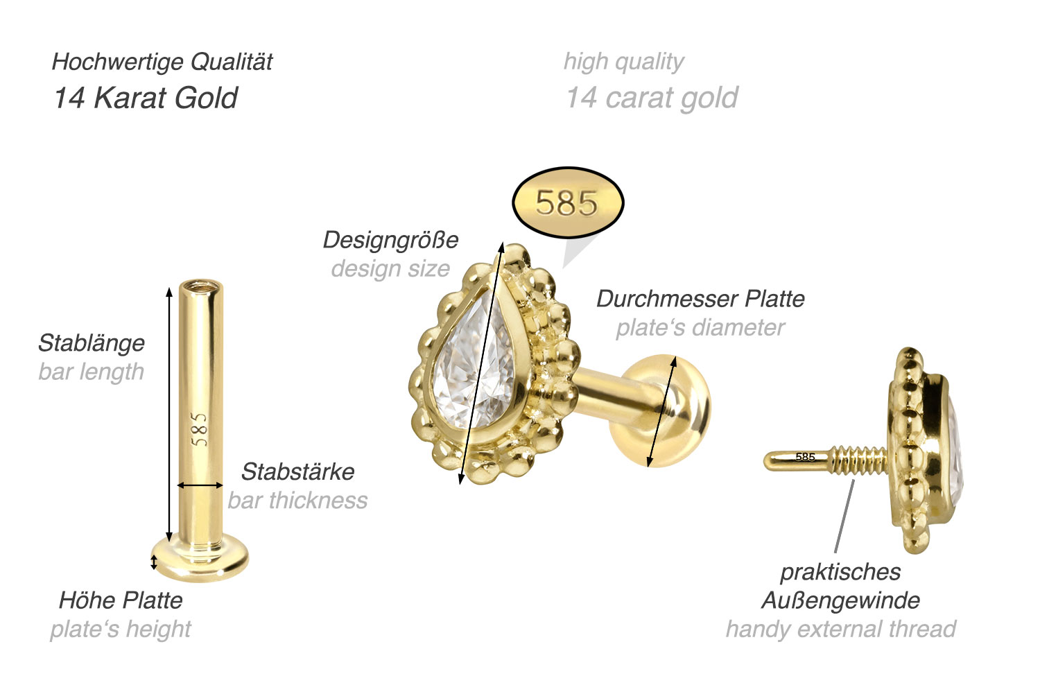 Dieses Labret ist mit Ausnahme des Moissanits vollständig aus hochwertigem 14 Karat (585er) Gold gefertigt, das neben seiner exzellenten Qualität auch mit Eigenschaften wie guter Hautverträglichkeit und hoher Beständigkeit zu begeistern weiß. Farblich ist es in Gelbgold, Roségold und rhodiniertem Weißgold erhältlich. Das Labret verfügt über einen zeitlos schönen Schraubaufsatz mit Außengewinde in Form eines Tropfens, welcher von mehreren Kugeln umgeben ist, hat eine Stabstärke von entweder 1 oder 1,2 mm und ist in den