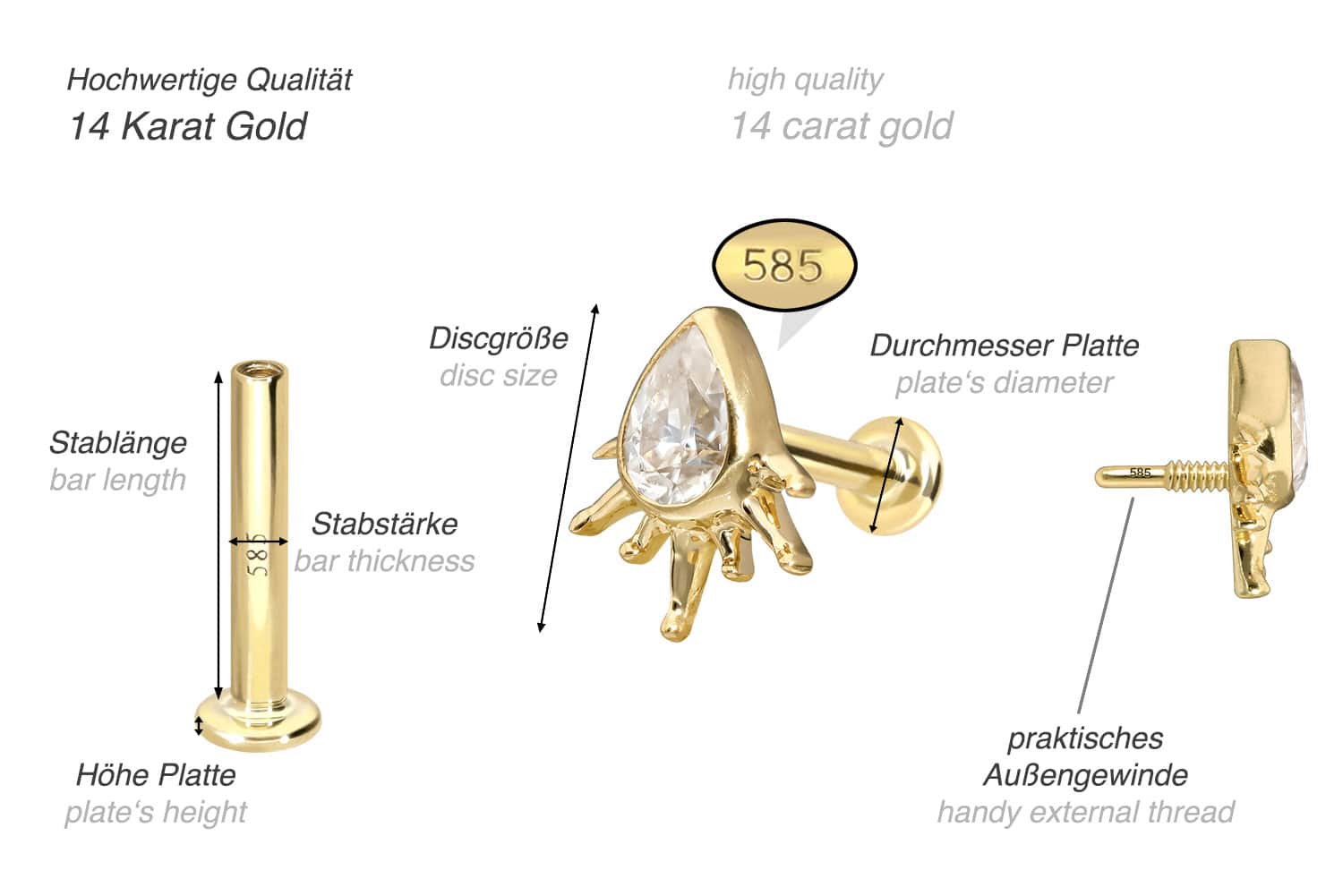 Dieses Labret ist mit Ausnahme des Moissanits vollständig aus hochwertigem 14 Karat (585er) Gold gefertigt, das neben seiner exzellenten Qualität auch mit Eigenschaften wie guter Hautverträglichkeit und hoher Beständigkeit zu begeistern weiß. Farblich ist es in Gelbgold, Roségold und rhodiniertem Weißgold erhältlich. Das Labret verfügt über einen zeitlos schönen Schraubaufsatz mit Außengewinde in Form eines Tropfens, welcher von Sonnenstrahlen umgeben ist, hat eine Stabstärke von entweder 1 oder 1,2 mm und ist in den
