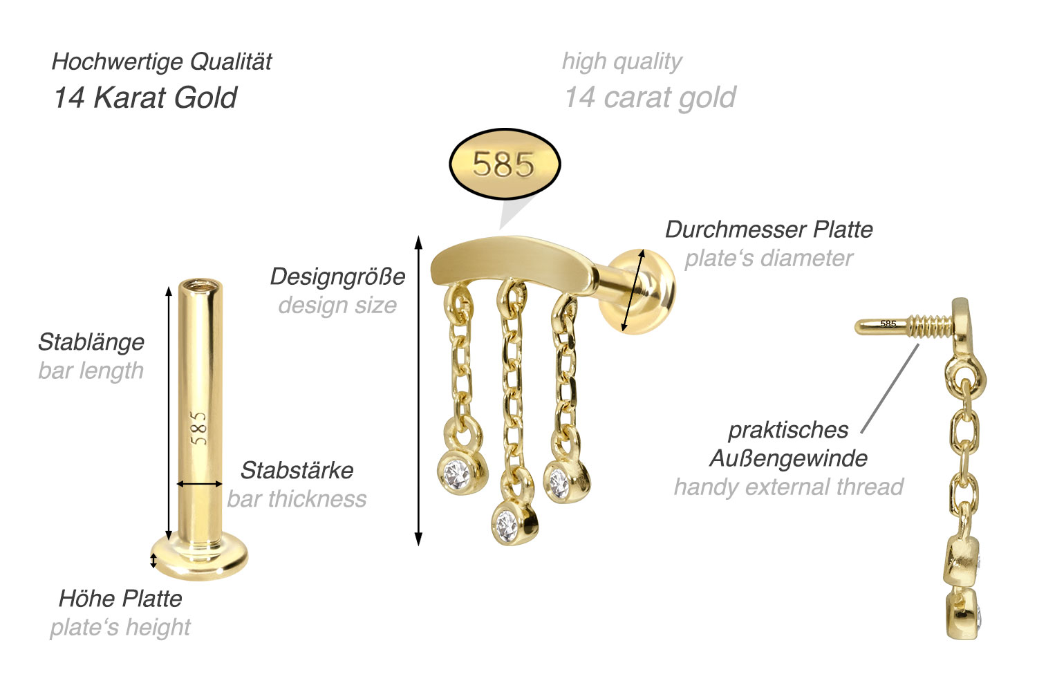 unten aufgeführten Stablängen erhältlich. Der Moissanit verleiht dem Schmuckstück seinen außergewöhnlichen, diamantenähnlichen Glanz. Jeder Einzelne unserer Artikel aus Gold wird mit viel Liebe zum Detail in Handarbeit gefertigt und ist somit ein Unikat. Das 0,8 mm starke Innengewinde des Labrets ist mit allen Gold Produkten, die über ein solches Außengewinde verfügen, kompatibel, sodass sich vielfältige Kombinationsmöglichkeiten ergeben.