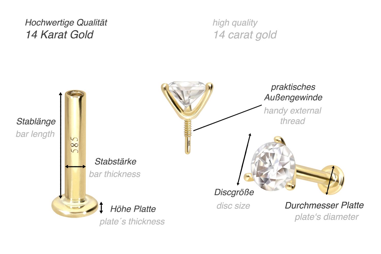 Dieses Labret ist mit Ausnahme des Moissanit vollständig aus hochwertigem 14 Karat (585er) Gold gefertigt, das neben seiner exzellenten Qualität auch mit Eigenschaften wie guter Hautverträglichkeit und hoher Beständigkeit zu begeistern weiß. Farblich ist es in Gelbgold, Roségold und rhodiniertem Weißgold erhältlich. Das Labret verfügt über einen zeitlos schönen Schraubaufsatz mit Außengewinde, hat