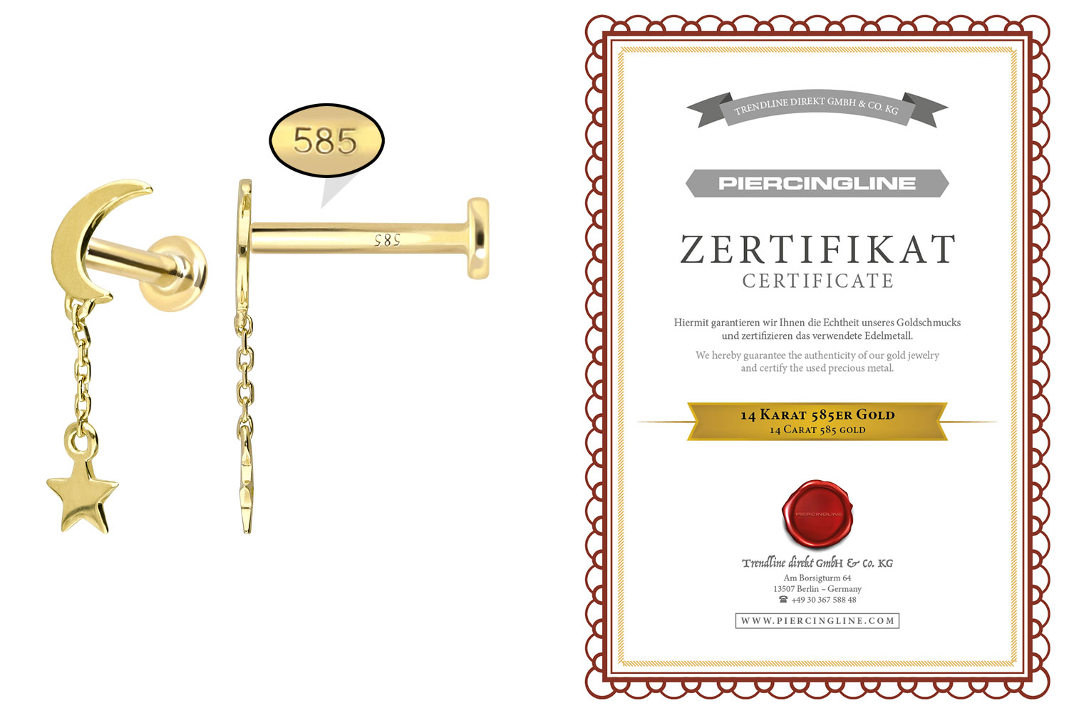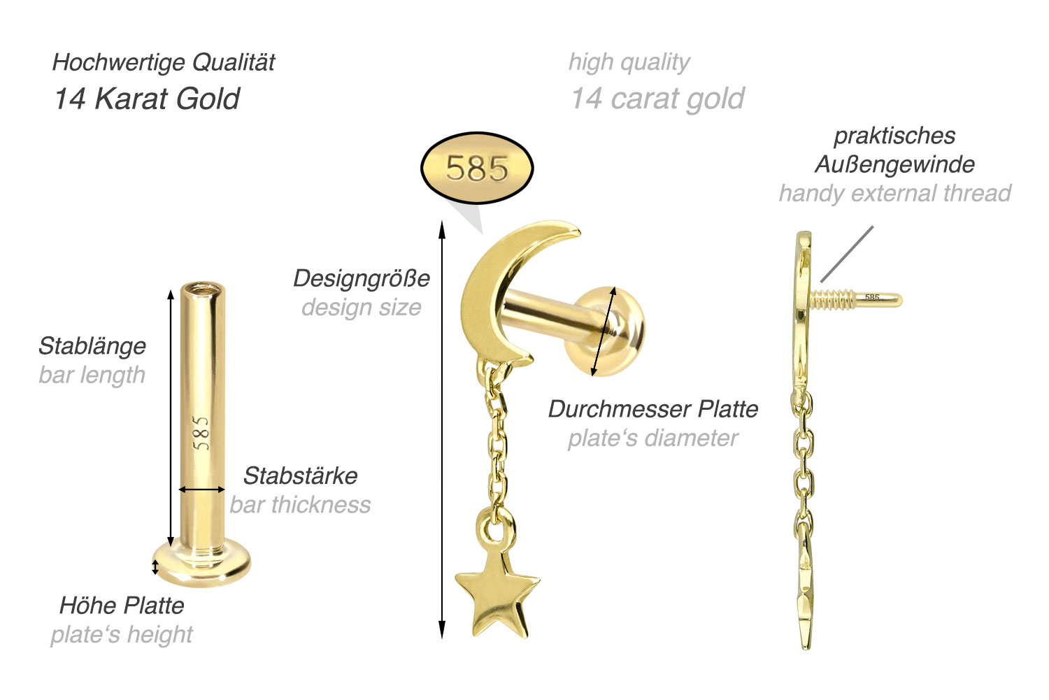 Dieses Labret ist vollständig aus hochwertigem 14 Karat (585er) Gold gefertigt, das neben seiner exzellenten Qualität auch mit Eigenschaften wie guter Hautverträglichkeit und hoher Beständigkeit zu begeistern weiß. Farblich ist es in Gelbgold, Roségold und rhodiniertem Weißgold erhältlich. Das Labret verfügt über einen zeitlos schönen Schraubaufsatz mit Außengewinde in Form eines Mondes, an welchem über eine Kette ein Stern befestigt ist, hat eine Stabstärke von entweder 1 oder 1,2 mm und ist in den