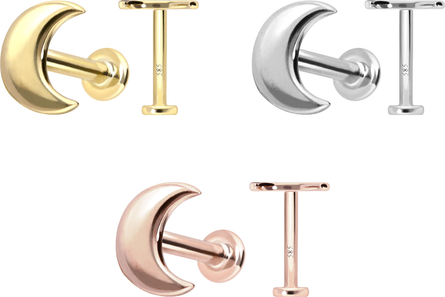 Dieses Labret ist vollständig aus hochwertigem 14 Karat (585er) Gold gefertigt, das neben seiner exzellenten Qualität auch mit Eigenschaften wie guter Hautverträglichkeit und hoher Beständigkeit zu begeistern weiß. Farblich ist es in Gelbgold, Roségold und rhodiniertem Weißgold erhältlich. Das Labret verfügt über einen zeitlos schönen Schraubaufsatz mit Außengewinde in Form eines Mondes, hat