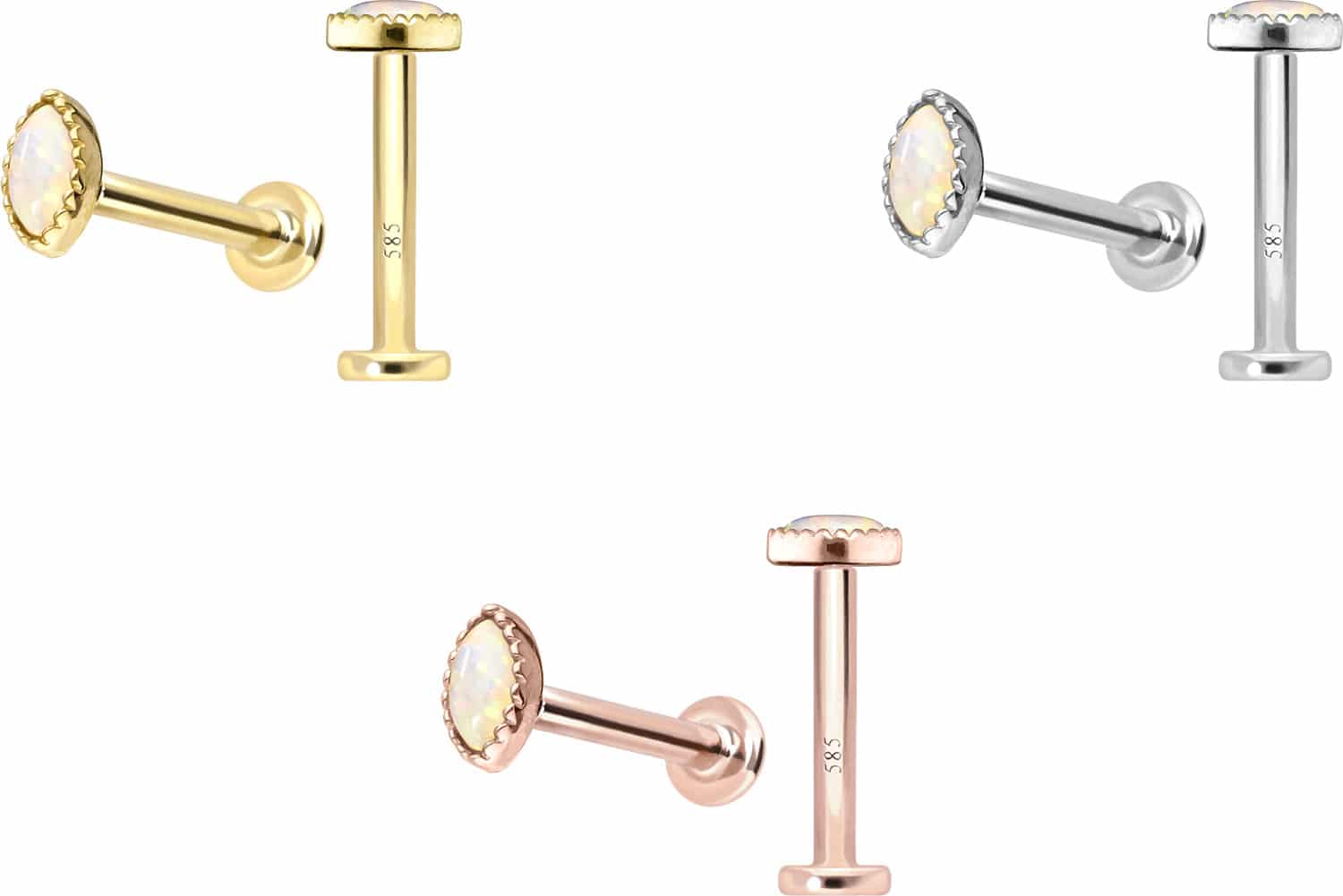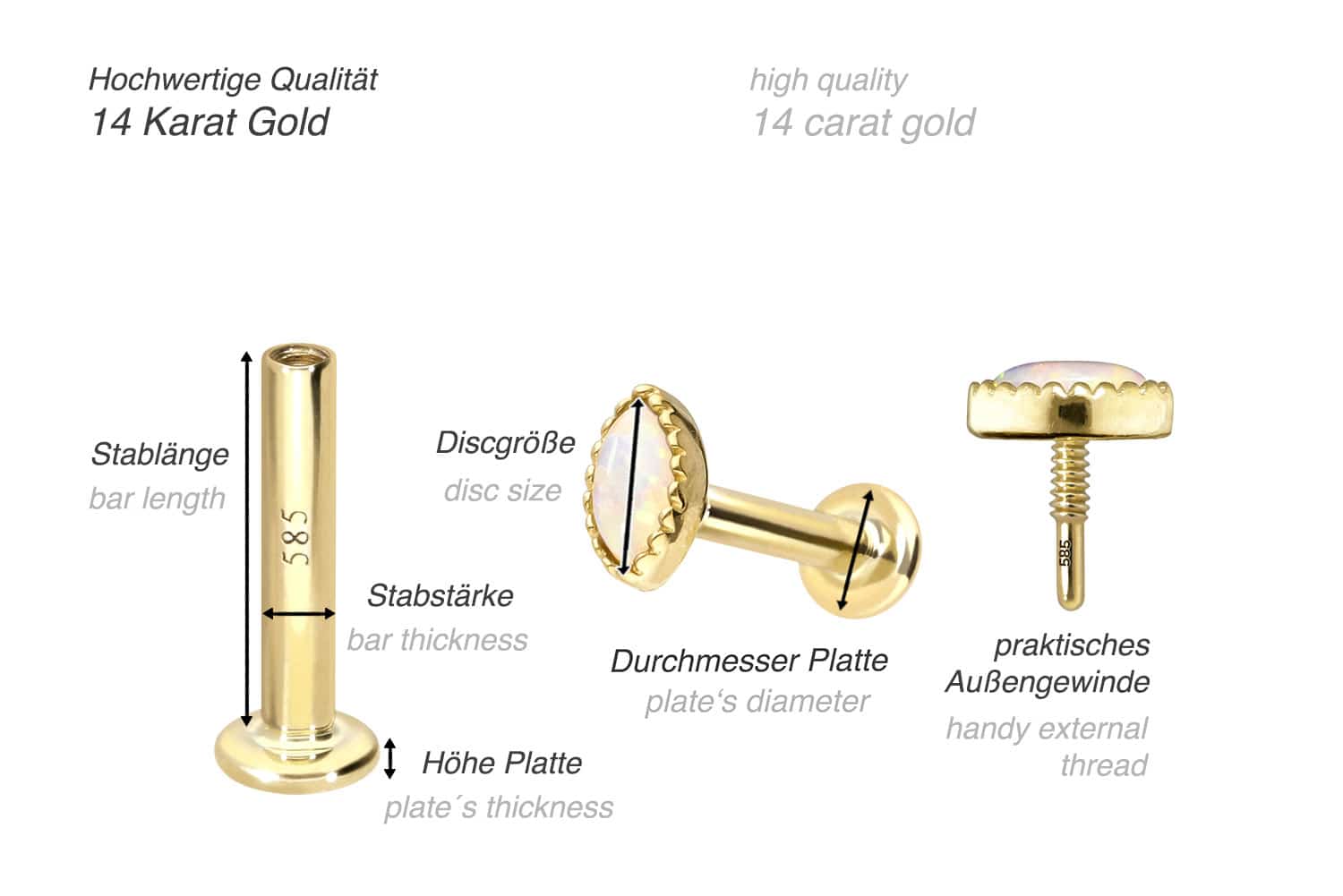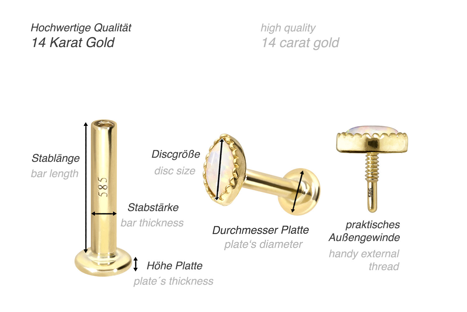 Dieses Labret ist mit Ausnahme des synthetischen opals vollständig aus hochwertigem 14 Karat (585er) Gold gefertigt, das neben seiner exzellenten Qualität auch mit Eigenschaften wie guter Hautverträglichkeit und hoher Beständigkeit zu begeistern weiß. Farblich ist es in Gelbgold, Roségold und rhodiniertem Weißgold erhältlich. Das Labret verfügt über einen zeitlos schönen Schraubaufsatz mit Außengewinde in Form eines Ovals, hat