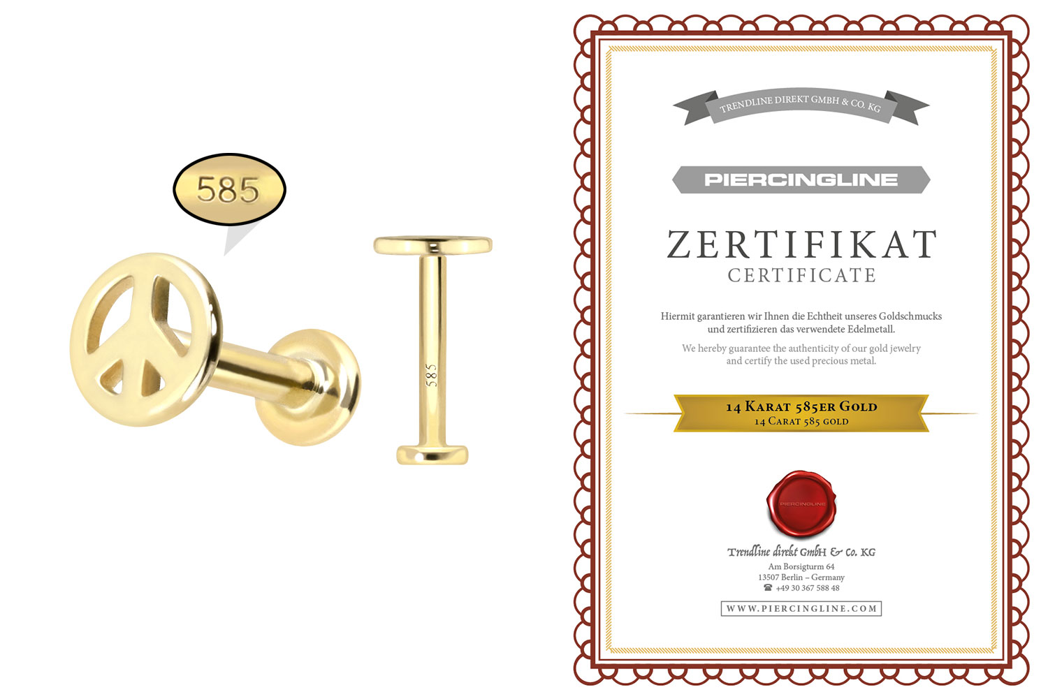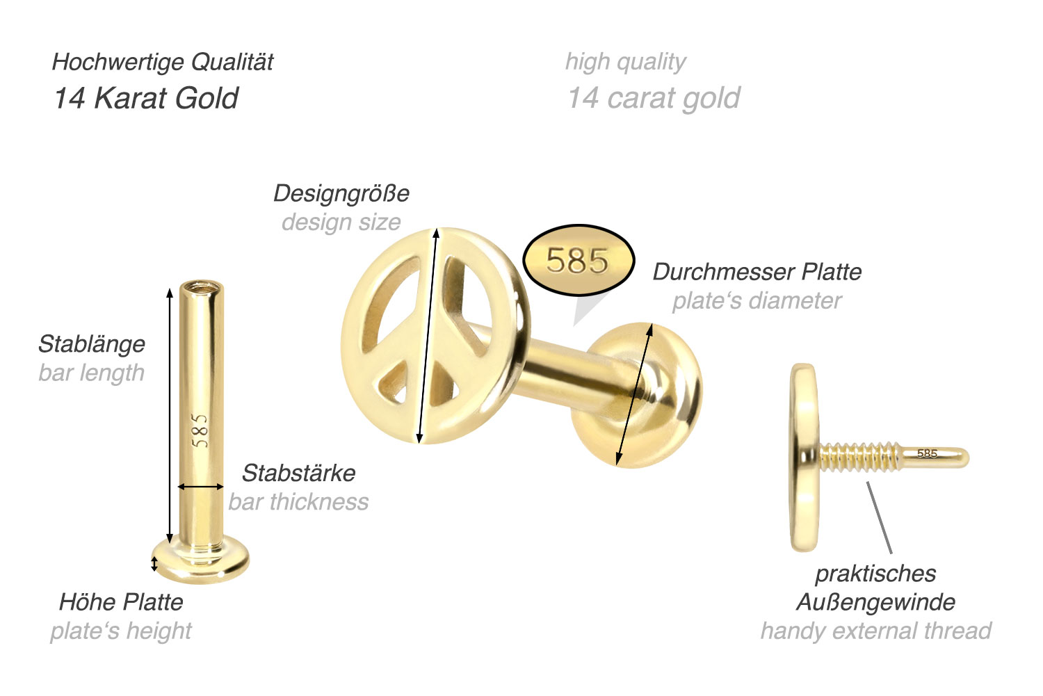 Dieses Labret ist vollständig aus hochwertigem 14 Karat (585er) Gold gefertigt, das neben seiner exzellenten Qualität auch mit Eigenschaften wie guter Hautverträglichkeit und hoher Beständigkeit zu begeistern weiß. Farblich ist es in Gelbgold, Roségold und rhodiniertem Weißgold erhältlich. Das Labret verfügt über einen zeitlos schönen Schraubaufsatz mit Außengewinde in Form eines Peace-Zeichens, hat