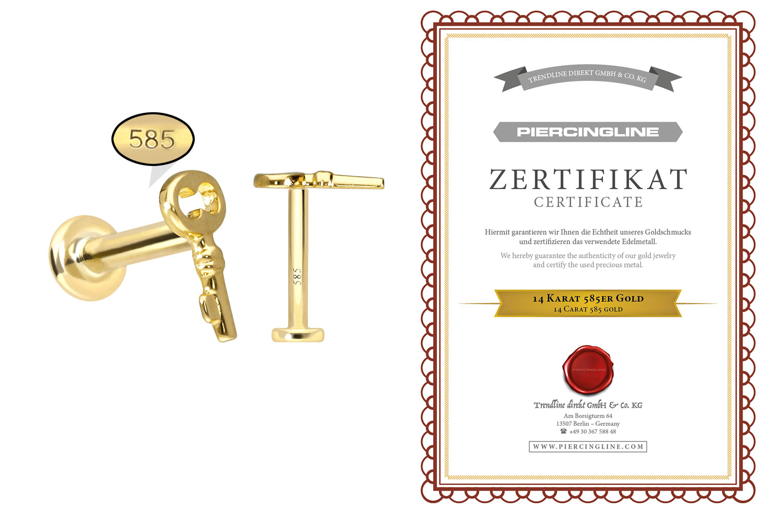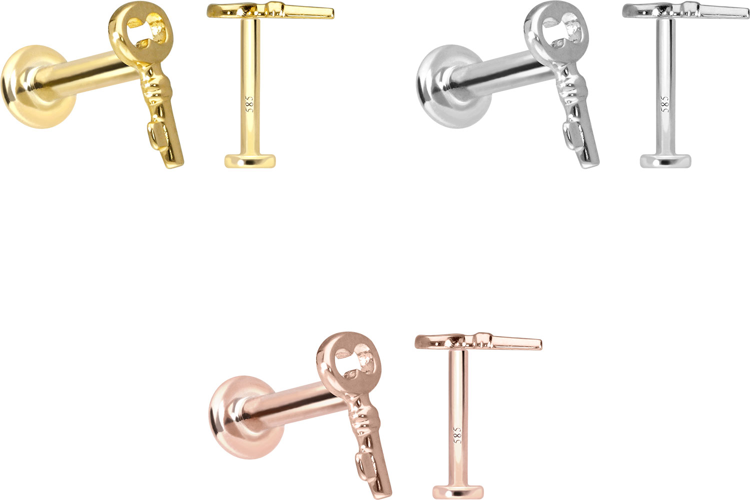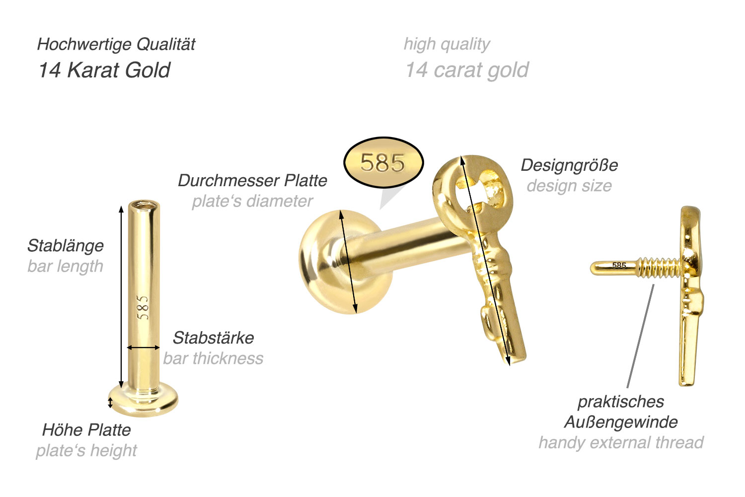 Dieses Labret ist vollständig aus hochwertigem 14 Karat (585er) Gold gefertigt, das neben seiner exzellenten Qualität auch mit Eigenschaften wie guter Hautverträglichkeit und hoher Beständigkeit zu begeistern weiß. Farblich ist es in Gelbgold, Roségold und rhodiniertem Weißgold erhältlich. Das Labret verfügt über einen zeitlos schönen Schraubaufsatz mit Außengewinde in Form eines Schlüssels, hat