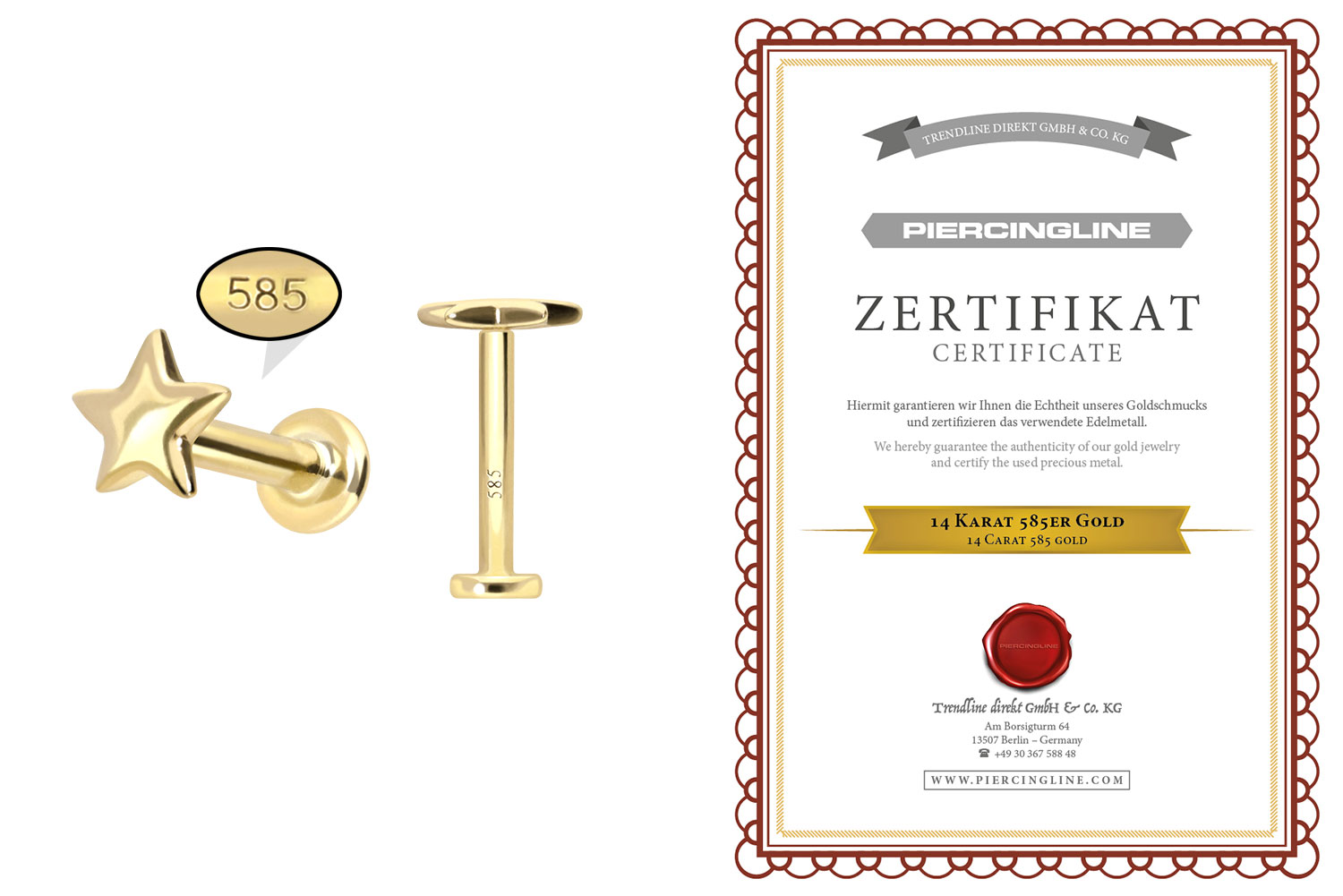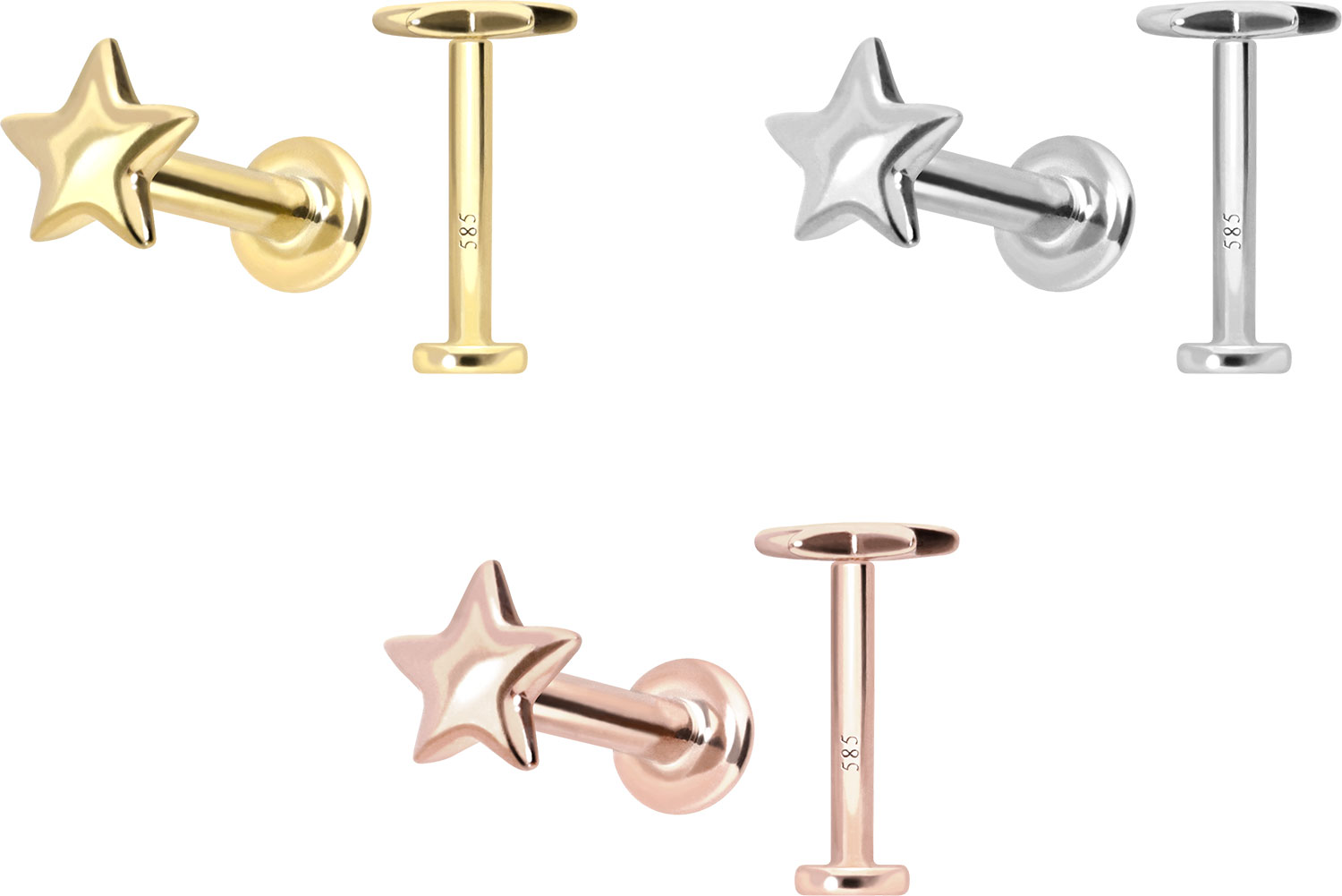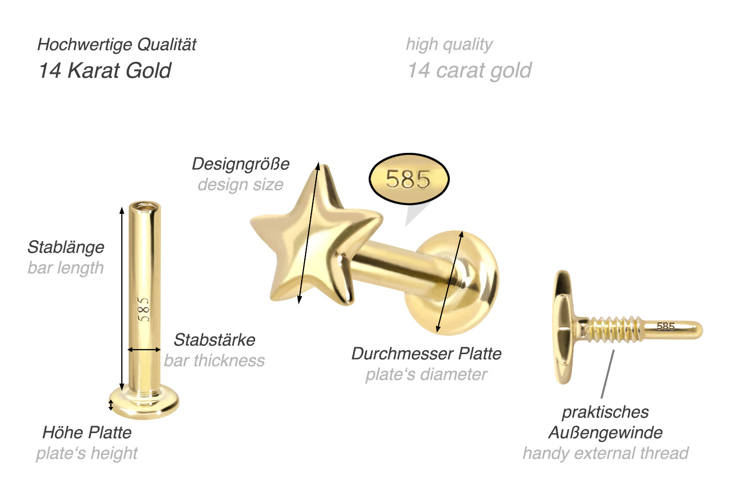 Dieses Labret ist vollständig aus hochwertigem 14 Karat (585er) Gold gefertigt, das neben seiner exzellenten Qualität auch mit Eigenschaften wie guter Hautverträglichkeit und hoher Beständigkeit zu begeistern weiß. Farblich ist es in Gelbgold, Roségold und rhodiniertem Weißgold erhältlich. Das Labret verfügt über einen zeitlos schönen Schraubaufsatz mit Außengewinde in Form eines Sterns, hat