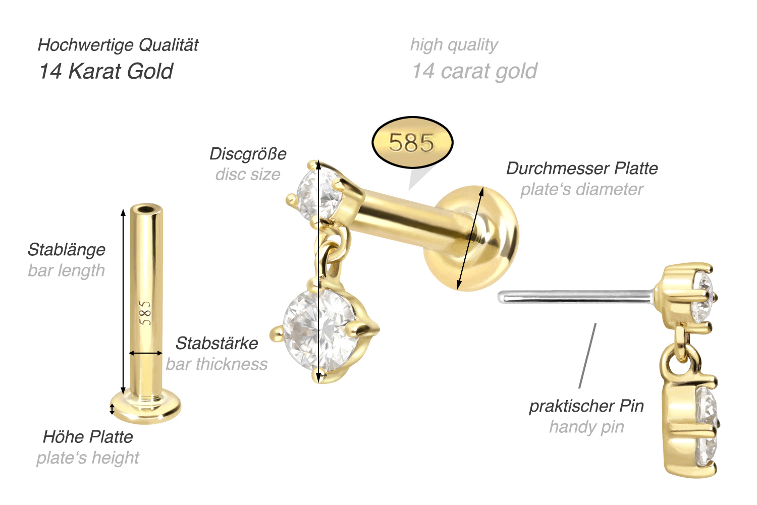 Dieses Labret ist mit Ausnahme der Moissanite aus hochwertigem 14 Karat (585er) Gold gefertigt, das neben seiner exzellenten Qualität auch mit Eigenschaften wie guter Hautverträglichkeit und hoher Beständigkeit zu begeistern weiß. Farblich ist es in Gelbgold, Roségold und rhodiniertem Weißgold erhältlich. Das Labret verfügt über einen zeitlos schönen Aufsatz mit Titan Push Pin, hat eine Stabstärke von entweder 1 oder 1,2 mm und ist in den unten aufgeführten Stablängen erhältlich. Der Moissanit verleiht dem Schmuckstück seinen außergewöhnlichen, diamantenähnlichen Glanz. Jeder Einzelne unserer Artikel aus Gold wird mit viel Liebe zum Detail in Handarbeit gefertigt und ist somit ein Unikat. Durch die verwendete Push Fit Technologie kann das Labret nach Belieben mit all unseren Gold Aufsätzen mit Titan Push Pin kombiniert werden.