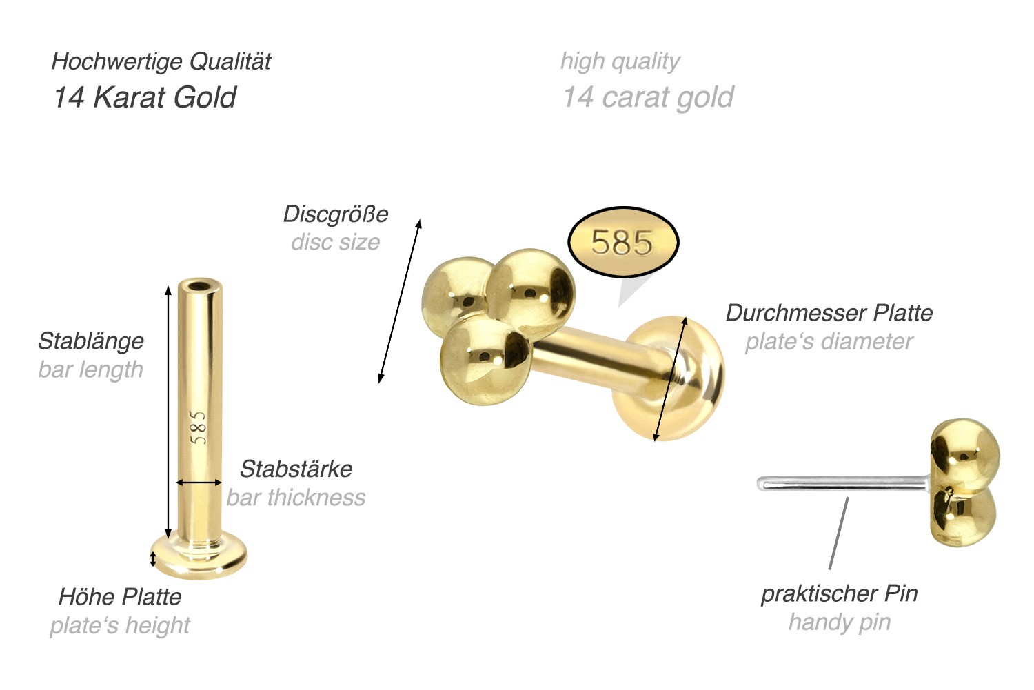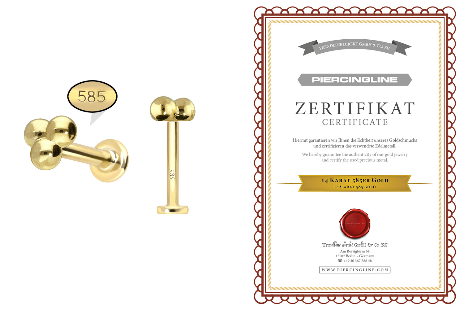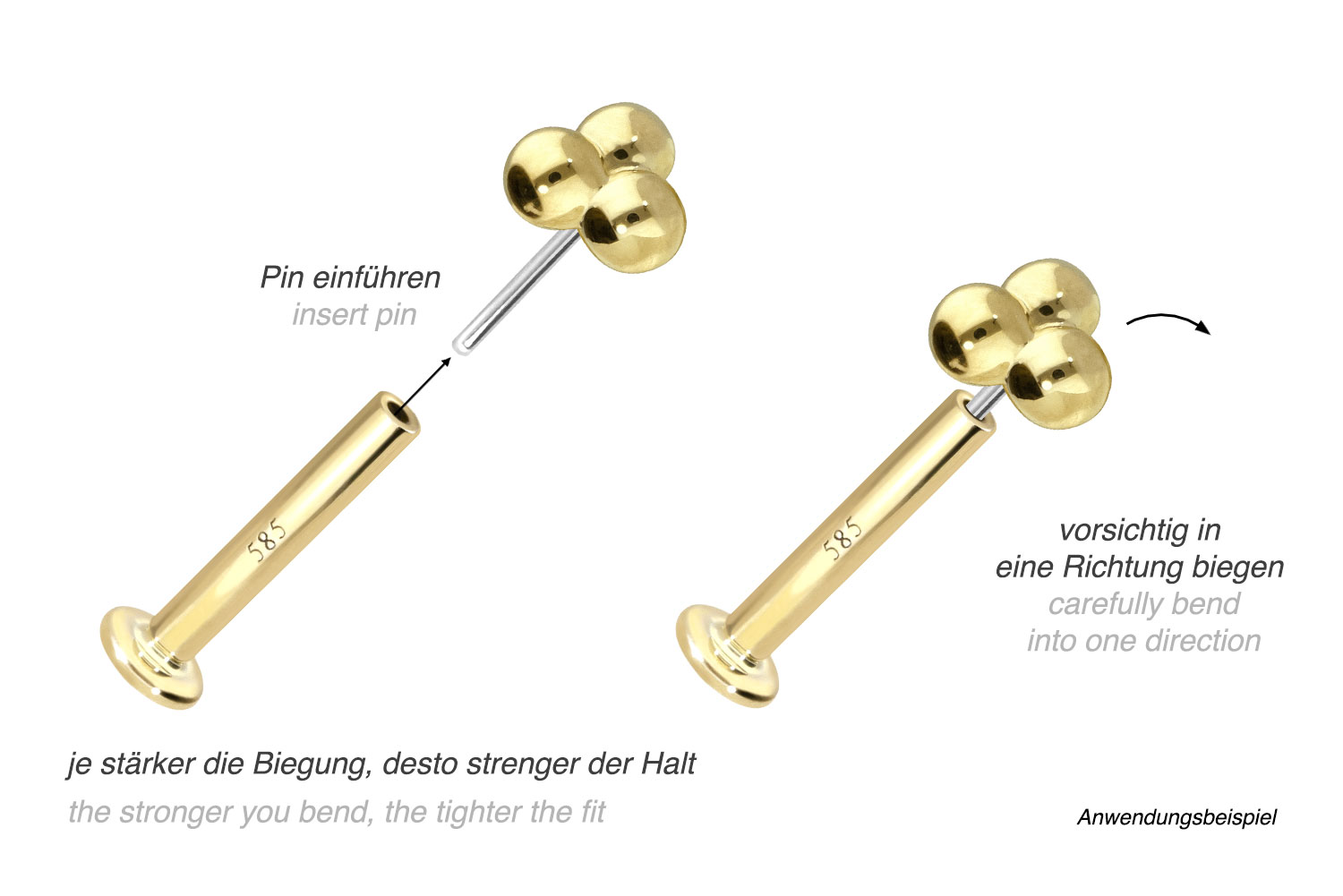 Dieses Labret ist aus hochwertigem 14 Karat (585er) Gold gefertigt, das neben seiner exzellenten Qualität auch mit Eigenschaften wie guter Hautverträglichkeit und hoher Beständigkeit zu begeistern weiß. Farblich ist es in Gelbgold, Roségold und rhodiniertem Weißgold erhältlich. Das Labret verfügt über einen zeitlos schönen Aufsatz mit Titan Push Pin in Form von drei Kugeln, hat eine Stabstärke von entweder 1 oder 1,2 mm und ist in den unten aufgeführten Stablängen erhältlich. Jeder Einzelne unserer Artikel aus Gold wird mit viel Liebe zum Detail in Handarbeit gefertigt und ist somit ein Unikat. Durch die verwendete Push Fit Technologie kann das Labret nach Belieben mit all unseren Gold Aufsätzen mit Titan Push Pin kombiniert werden.