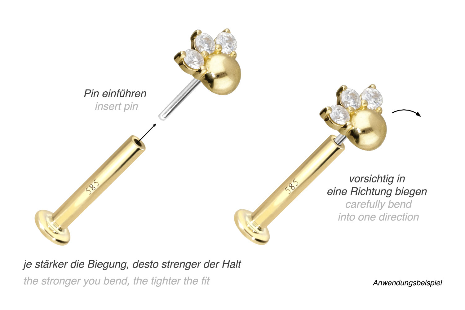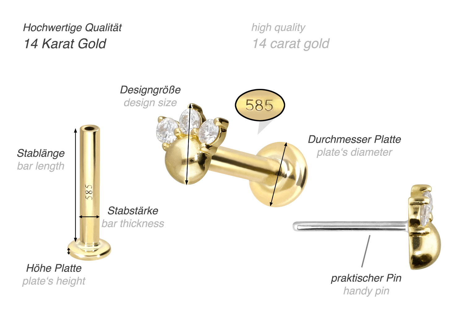Dieses Labret ist mit Ausnahme der Moissanite aus hochwertigem 14 Karat (585er) Gold gefertigt, das neben seiner exzellenten Qualität auch mit Eigenschaften wie guter Hautverträglichkeit und hoher Beständigkeit zu begeistern weiß. Farblich ist es in Gelbgold, Roségold und rhodiniertem Weißgold erhältlich. Das Labret verfügt über einen zeitlos schönen Aufsatz mit Titan Push Pin, hat eine Stabstärke von entweder 1 oder 1,2 mm und ist in den unten aufgeführten Stablängen erhältlich. Der Moissanit verleiht dem Schmuckstück seinen außergewöhnlichen, diamantenähnlichen Glanz. Jeder Einzelne unserer Artikel aus Gold wird mit viel Liebe zum Detail in Handarbeit gefertigt und ist somit ein Unikat. Durch die verwendete Push Fit Technologie kann das Labret nach Belieben mit all unseren Gold Aufsätzen mit Titan Push Pin kombiniert werden.
