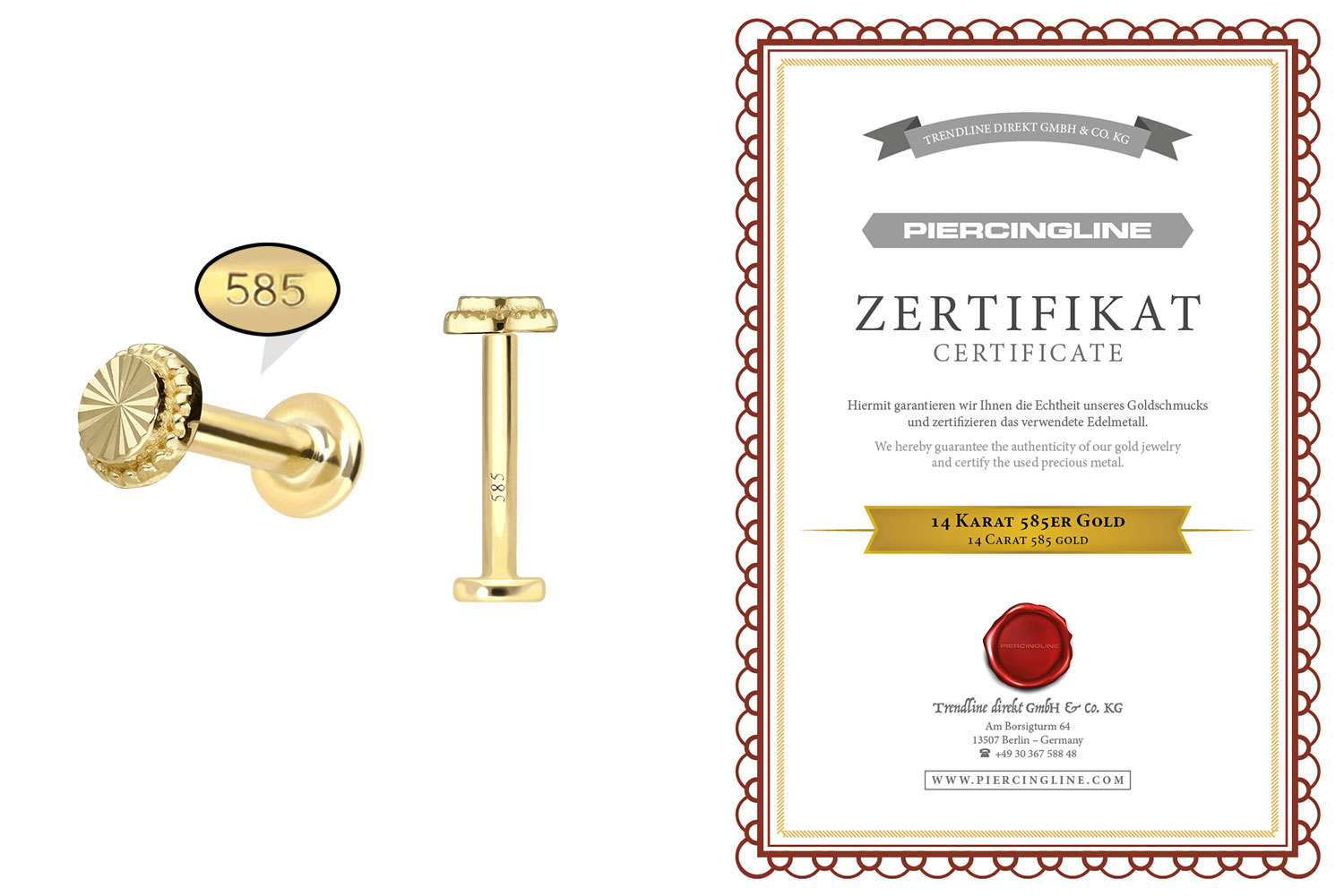 Dieses Labret ist aus hochwertigem 14 Karat (585er) Gold gefertigt, das neben seiner exzellenten Qualität auch mit Eigenschaften wie guter Hautverträglichkeit und hoher Beständigkeit zu begeistern weiß. Farblich ist es in Gelbgold, Roségold und rhodiniertem Weißgold erhältlich. Das Labret verfügt über eine zeitlos schöne Disc mit Titan Push Pin, hat eine Stabstärke von entweder 1 oder 1,2 mm und ist in den unten aufgeführten Stablängen erhältlich. Jeder Einzelne unserer Artikel aus Gold wird mit viel Liebe zum Detail in Handarbeit gefertigt und ist somit ein Unikat. Durch die verwendete Push Fit Technologie kann das Labret nach Belieben mit all unseren Gold Aufsätzen mit Titan Push Pin kombiniert werden.