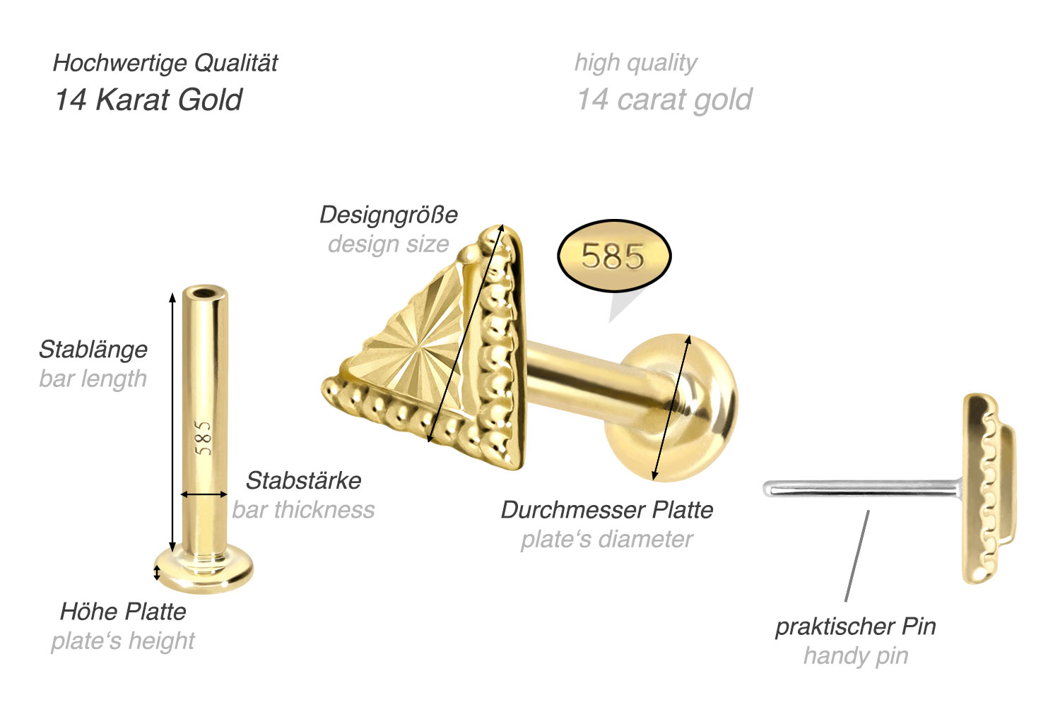 Dieses Labret ist aus hochwertigem 14 Karat (585er) Gold gefertigt, das neben seiner exzellenten Qualität auch mit Eigenschaften wie guter Hautverträglichkeit und hoher Beständigkeit zu begeistern weiß. Farblich ist es in Gelbgold, Roségold und rhodiniertem Weißgold erhältlich. Das Labret verfügt über einen zeitlos schönen Aufsatz mit Titan Push Pin in Form eines Dreiecks, hat eine Stabstärke von entweder 1 oder 1,2 mm und ist in den unten aufgeführten Stablängen erhältlich. Jeder Einzelne unserer Artikel aus Gold wird mit viel Liebe zum Detail in Handarbeit gefertigt und ist somit ein Unikat. Durch die verwendete Push Fit Technologie kann das Labret nach Belieben mit all unseren Gold Aufsätzen mit Titan Push Pin kombiniert werden.