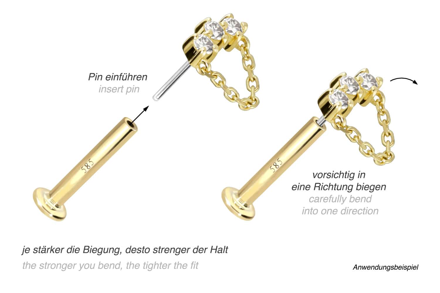 14 Karat Gold - Labret mit Push Fit Moissanit-Bogen + Kette