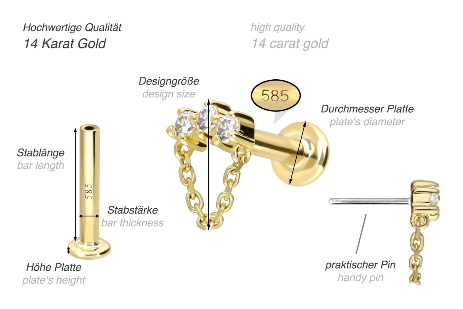 Dieses Labret ist mit Ausnahme der Moissanite aus hochwertigem 14 Karat (585er) Gold gefertigt, das neben seiner exzellenten Qualität auch mit Eigenschaften wie guter Hautverträglichkeit und hoher Beständigkeit zu begeistern weiß. Farblich ist es in Gelbgold, Roségold und rhodiniertem Weißgold erhältlich. Das Labret verfügt über einen zeitlos schönen Aufsatz mit Titan Push Pin, hat eine Stabstärke von entweder 1 oder 1,2 mm und ist in den unten aufgeführten Stablängen erhältlich. Der Moissanit verleiht dem Schmuckstück seinen außergewöhnlichen, diamantenähnlichen Glanz. Jeder Einzelne unserer Artikel aus Gold wird mit viel Liebe zum Detail in Handarbeit gefertigt und ist somit ein Unikat. Durch die verwendete Push Fit Technologie kann das Labret nach Belieben mit all unseren Gold Aufsätzen mit Titan Push Pin kombiniert werden.