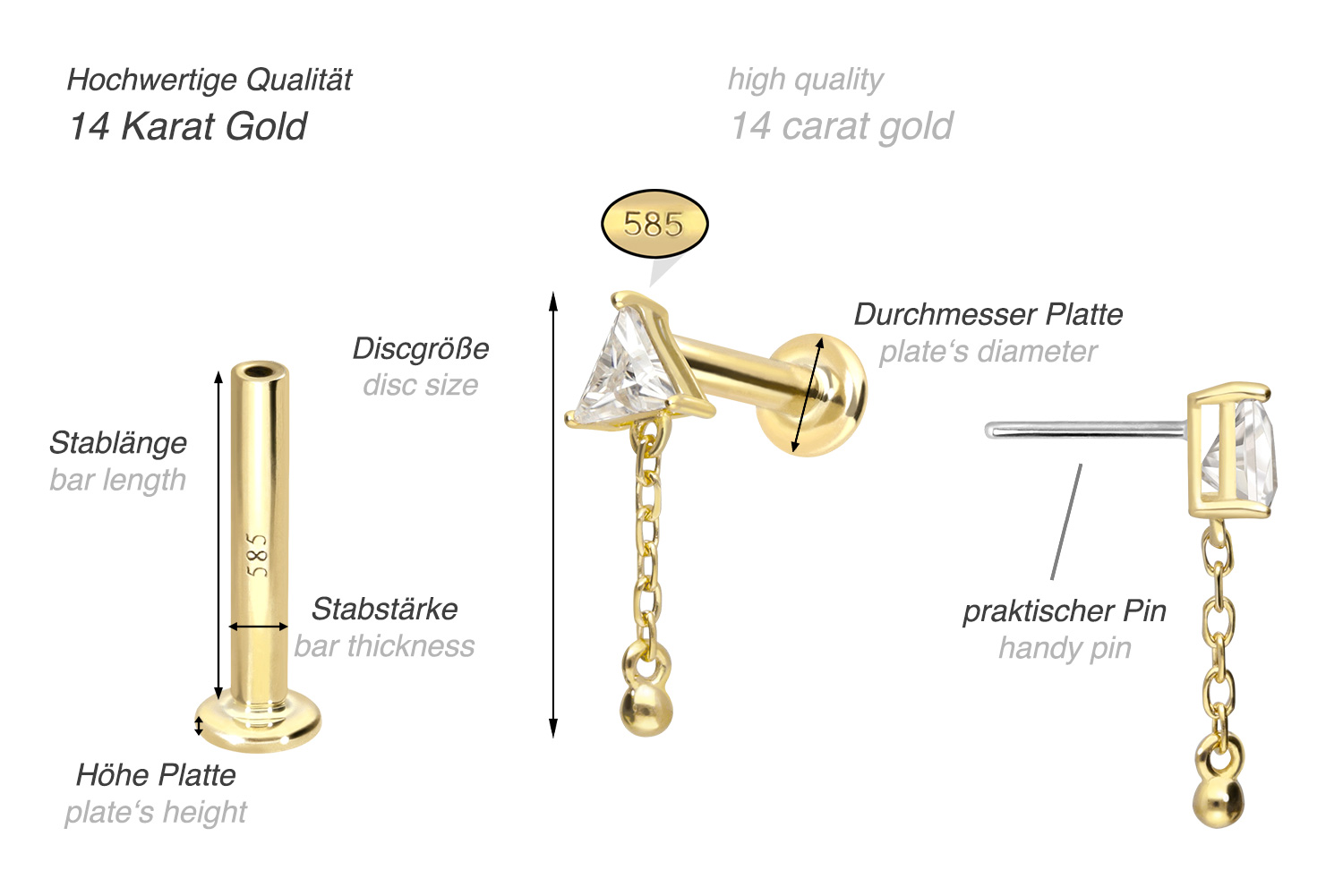 Dieses Labret ist mit Ausnahme des Moissanits aus hochwertigem 14 Karat (585er) Gold gefertigt, das neben seiner exzellenten Qualität auch mit Eigenschaften wie guter Hautverträglichkeit und hoher Beständigkeit zu begeistern weiß. Farblich ist es in Gelbgold, Roségold und rhodiniertem Weißgold erhältlich. Das Labret verfügt über einen zeitlos schönen Aufsatz mit Titan Push Pin in Form eines Dreiecks, an welchem eine Kette befestigt ist, hat eine Stabstärke von entweder 1 oder 1,2 mm und ist in den unten aufgeführten Stablängen erhältlich. Der Moissanit verleiht dem Schmuckstück seinen außergewöhnlichen, diamantenähnlichen Glanz. Jeder Einzelne unserer Artikel aus Gold wird mit viel Liebe zum Detail in Handarbeit gefertigt und ist somit ein Unikat. Durch die verwendete Push Fit Technologie kann das Labret nach Belieben mit all unseren Gold Aufsätzen mit Titan Push Pin kombiniert werden.