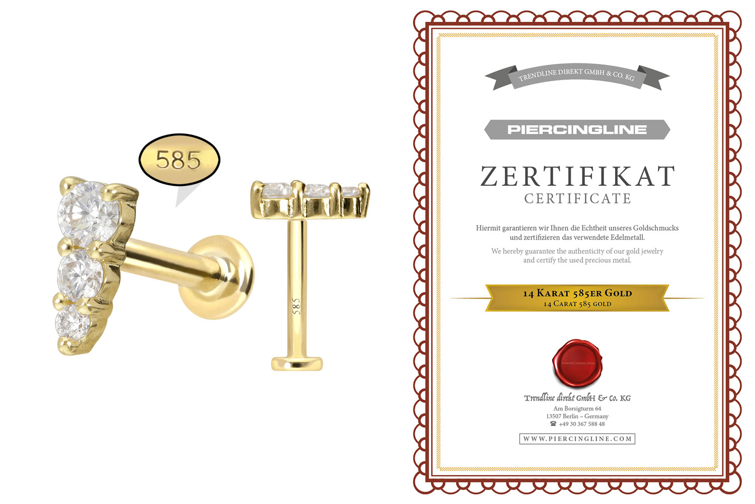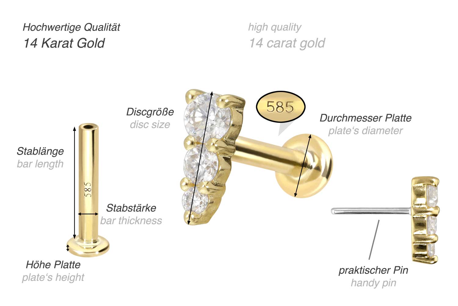 Dieses Labret ist mit Ausnahme der Moissanite aus hochwertigem 14 Karat (585er) Gold gefertigt, das neben seiner exzellenten Qualität auch mit Eigenschaften wie guter Hautverträglichkeit und hoher Beständigkeit zu begeistern weiß. Farblich ist es in Gelbgold, Roségold und rhodiniertem Weißgold erhältlich. Das Labret verfügt über einen zeitlos schönen Aufsatz mit Titan Push Pin in Form eines Eiszapfens, hat eine Stabstärke von entweder 1 oder 1,2 mm und ist in den unten aufgeführten Stablängen erhältlich. Der Moissanit verleiht dem Schmuckstück seinen außergewöhnlichen, diamantenähnlichen Glanz. Jeder Einzelne unserer Artikel aus Gold wird mit viel Liebe zum Detail in Handarbeit gefertigt und ist somit ein Unikat. Durch die verwendete Push Fit Technologie kann das Labret nach Belieben mit all unseren Gold Aufsätzen mit Titan Push Pin kombiniert werden.