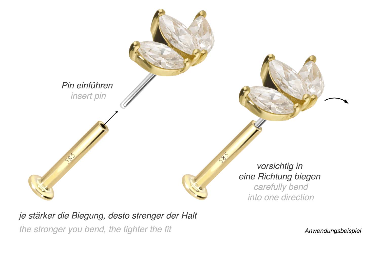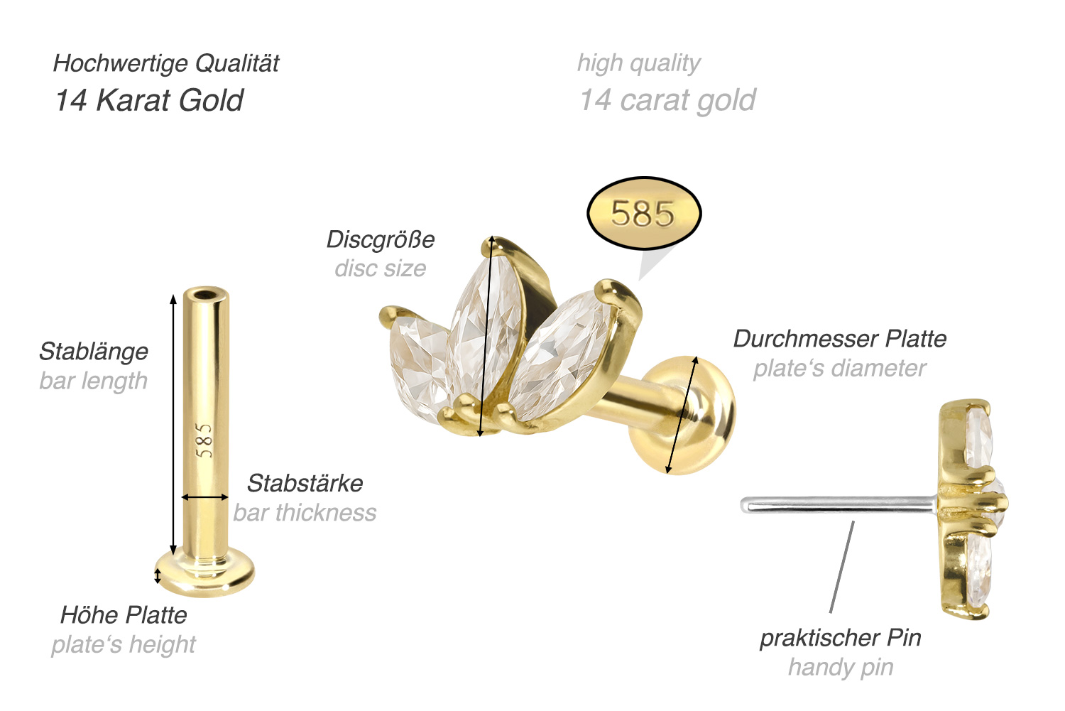 Dieses Labret ist mit Ausnahme der Moissanite aus hochwertigem 14 Karat (585er) Gold gefertigt, das neben seiner exzellenten Qualität auch mit Eigenschaften wie guter Hautverträglichkeit und hoher Beständigkeit zu begeistern weiß. Farblich ist es in Gelbgold, Roségold und rhodiniertem Weißgold erhältlich. Das Labret verfügt über einen zeitlos schönen Aufsatz mit Titan Push Pin in Form einer Lotusblüte, hat eine Stabstärke von entweder 1 oder 1,2 mm und ist in den unten aufgeführten Stablängen erhältlich. Der Moissanit verleiht dem Schmuckstück seinen außergewöhnlichen, diamantenähnlichen Glanz. Jeder Einzelne unserer Artikel aus Gold wird mit viel Liebe zum Detail in Handarbeit gefertigt und ist somit ein Unikat. Durch die verwendete Push Fit Technologie kann das Labret nach Belieben mit all unseren Gold Aufsätzen mit Titan Push Pin kombiniert werden.