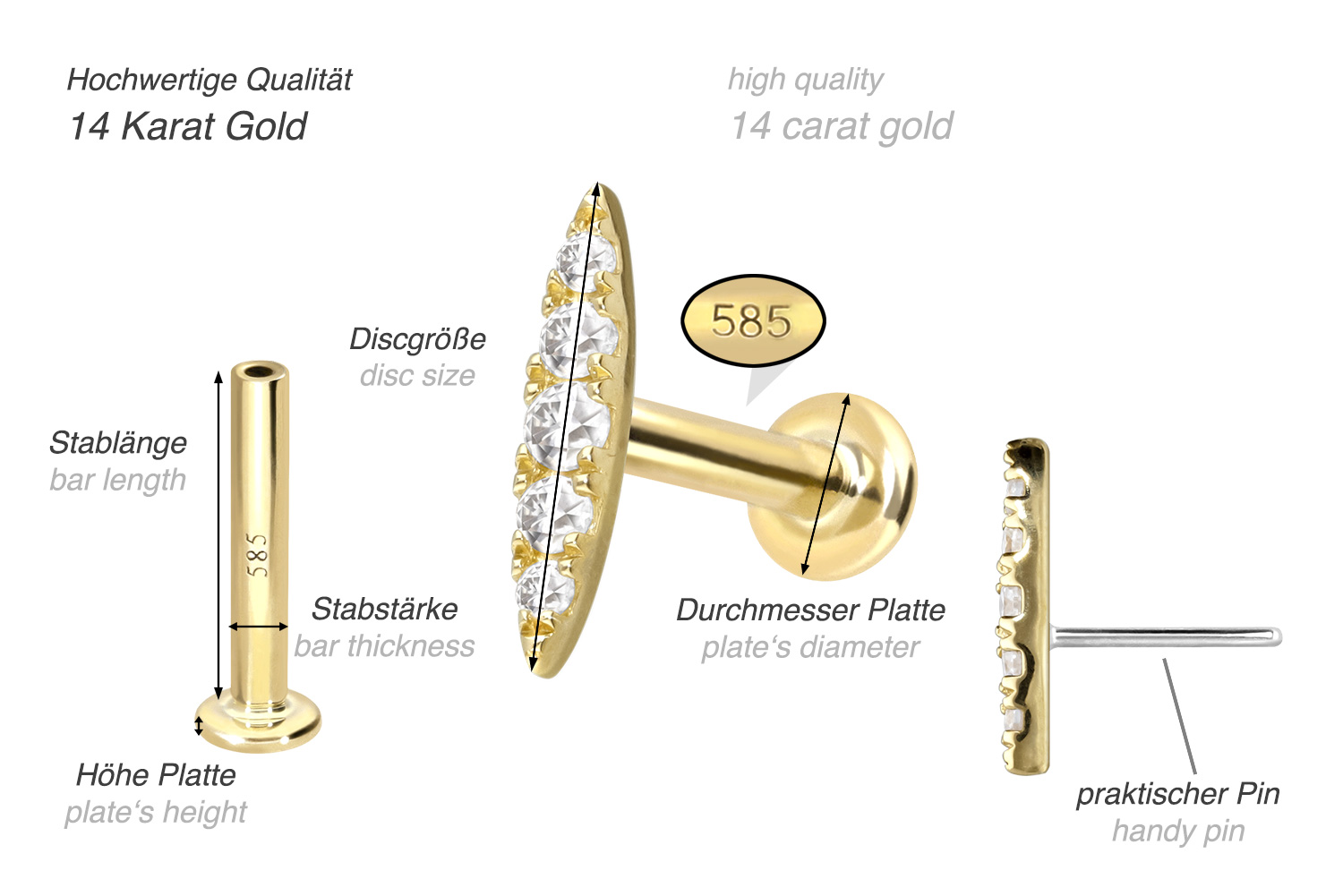 Dieses Labret ist mit Ausnahme der Moissanite aus hochwertigem 14 Karat (585er) Gold gefertigt, das neben seiner exzellenten Qualität auch mit Eigenschaften wie guter Hautverträglichkeit und hoher Beständigkeit zu begeistern weiß. Farblich ist es in Gelbgold, Roségold und rhodiniertem Weißgold erhältlich. Das Labret verfügt über einen zeitlos schönen Aufsatz mit Titan Push Pin in Form eines Ovals, hat eine Stabstärke von entweder 1 oder 1,2 mm und ist in den unten aufgeführten Stablängen erhältlich. Der Moissanit verleiht dem Schmuckstück seinen außergewöhnlichen, diamantenähnlichen Glanz. Jeder Einzelne unserer Artikel aus Gold wird mit viel Liebe zum Detail in Handarbeit gefertigt und ist somit ein Unikat. Durch die verwendete Push Fit Technologie kann das Labret nach Belieben mit all unseren Gold Aufsätzen mit Titan Push Pin kombiniert werden.