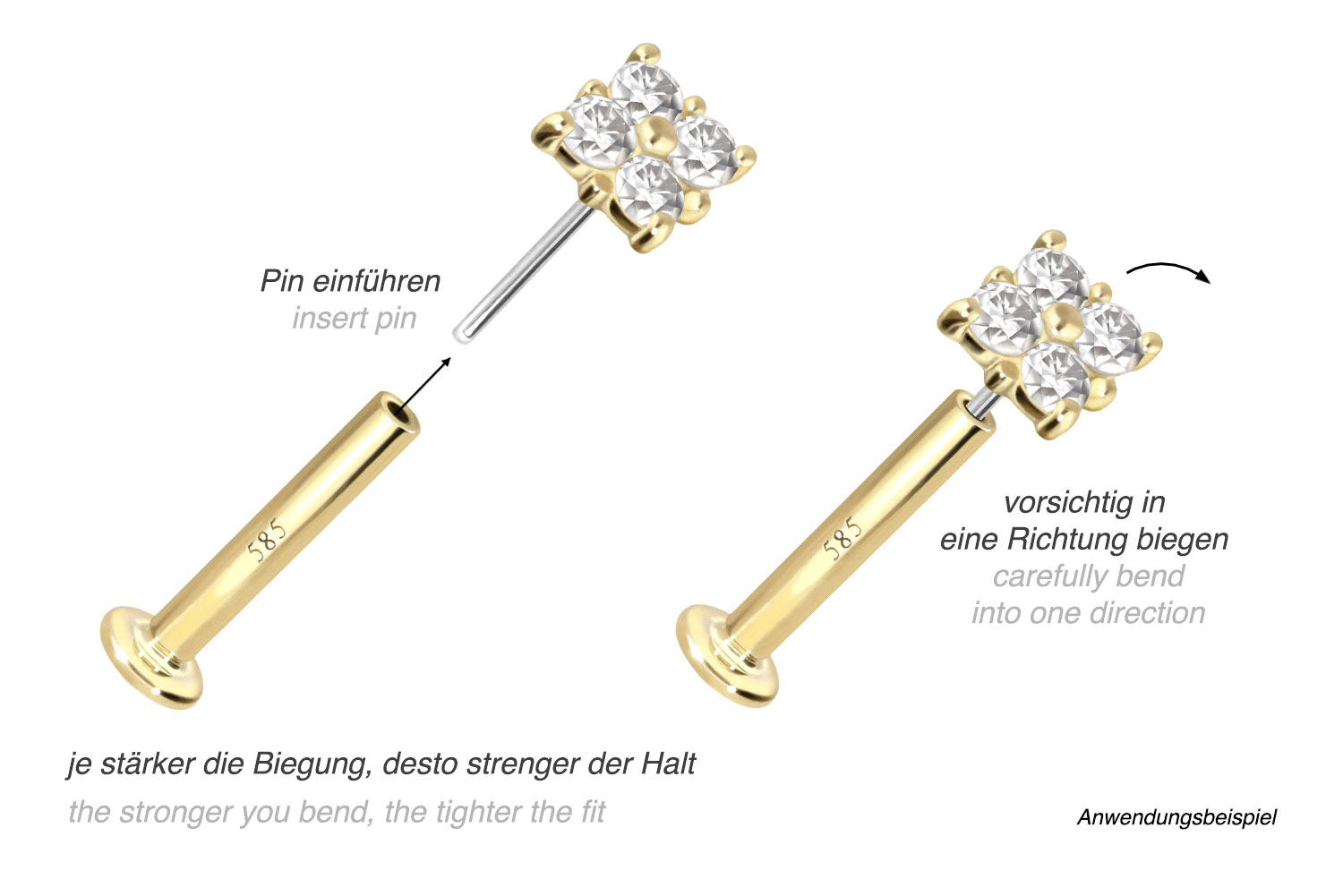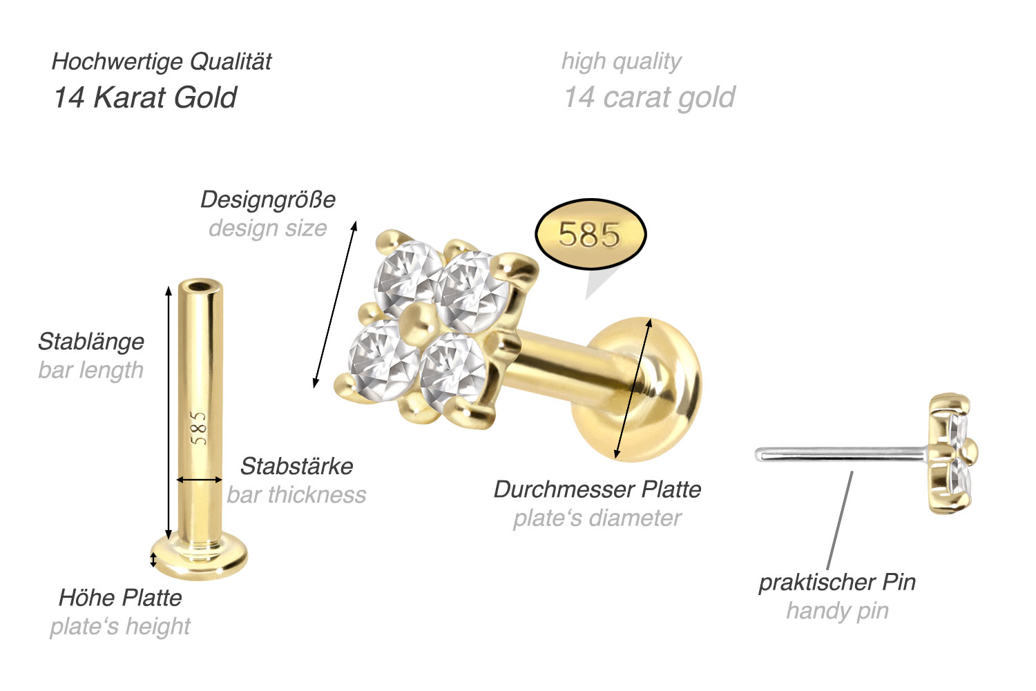Dieses Labret ist mit Ausnahme der Moissanite aus hochwertigem 14 Karat (585er) Gold gefertigt, das neben seiner exzellenten Qualität auch mit Eigenschaften wie guter Hautverträglichkeit und hoher Beständigkeit zu begeistern weiß. Farblich ist es in Gelbgold, Roségold und rhodiniertem Weißgold erhältlich. Das Labret verfügt über einen zeitlos schönen Aufsatz mit Titan Push Pin in Form eines Quadrats, hat eine Stabstärke von entweder 1 oder 1,2 mm und ist in den unten aufgeführten Stablängen erhältlich. Der Moissanit verleiht dem Schmuckstück seinen außergewöhnlichen, diamantenähnlichen Glanz. Jeder Einzelne unserer Artikel aus Gold wird mit viel Liebe zum Detail in Handarbeit gefertigt und ist somit ein Unikat. Durch die verwendete Push Fit Technologie kann das Labret nach Belieben mit all unseren Gold Aufsätzen mit Titan Push Pin kombiniert werden.
