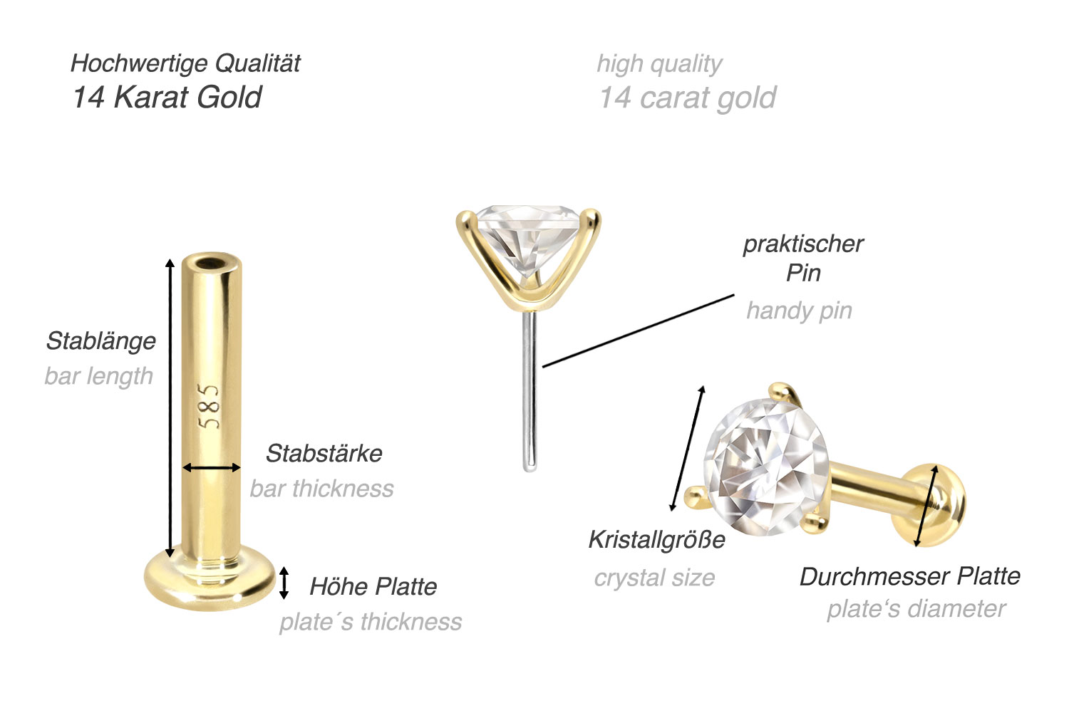 Dieses Labret ist mit Ausnahme des Moissanits aus hochwertigem 14 Karat (585er) Gold gefertigt, das neben seiner exzellenten Qualität auch mit Eigenschaften wie guter Hautverträglichkeit und hoher Beständigkeit zu begeistern weiß. Farblich ist es in Gelbgold, Roségold und rhodiniertem Weißgold erhältlich. Das Labret verfügt über einen zeitlos schönen Aufsatz mit Titan Push Pin, hat eine Stabstärke von entweder 1 oder 1,2 mm und ist in den unten aufgeführten Stablängen erhältlich. Der Moissanit verleiht dem Schmuckstück seinen außergewöhnlichen, diamantenähnlichen Glanz. Jeder Einzelne unserer Artikel aus Gold wird mit viel Liebe zum Detail in Handarbeit gefertigt und ist somit ein Unikat. Durch die verwendete Push Fit Technologie kann das Labret nach Belieben mit all unseren Gold Aufsätzen mit Titan Push Pin kombiniert werden.