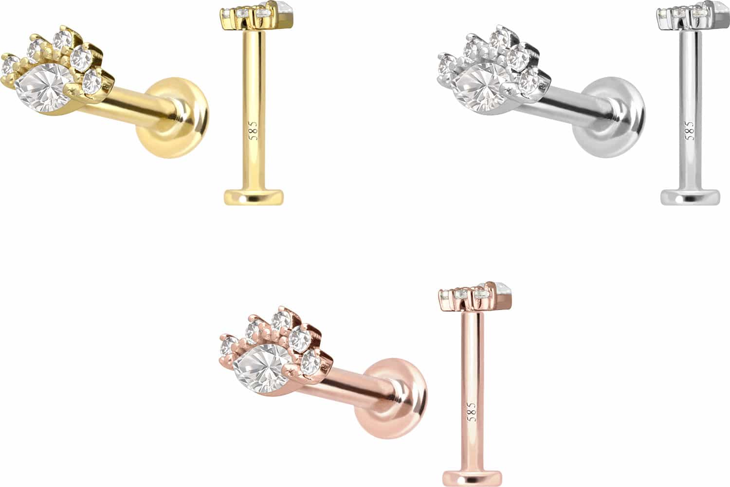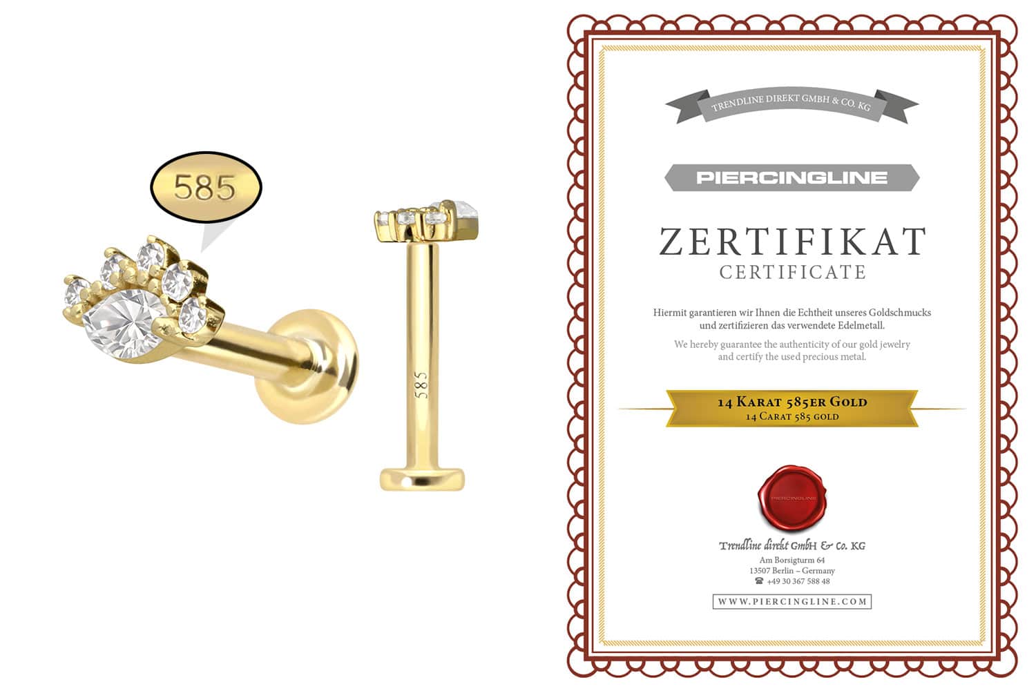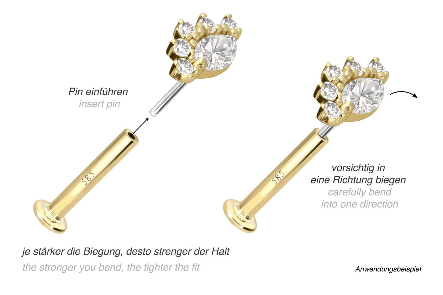 Dieses Labret ist mit Ausnahme der Moissanite aus hochwertigem 14 Karat (585er) Gold gefertigt, das neben seiner exzellenten Qualität auch mit Eigenschaften wie guter Hautverträglichkeit und hoher Beständigkeit zu begeistern weiß. Farblich ist es in Gelbgold, Roségold und rhodiniertem Weißgold erhältlich. Das Labret verfügt über einen zeitlos schönen Aufsatz mit Titan Push Pin, hat eine Stabstärke von entweder 1 oder 1,2 mm und ist in den unten aufgeführten Stablängen erhältlich. Der Moissanit verleiht dem Schmuckstück seinen außergewöhnlichen, diamantenähnlichen Glanz. Jeder Einzelne unserer Artikel aus Gold wird mit viel Liebe zum Detail in Handarbeit gefertigt und ist somit ein Unikat. Durch die verwendete Push Fit Technologie kann das Labret nach Belieben mit all unseren Gold Aufsätzen mit Titan Push Pin kombiniert werden.