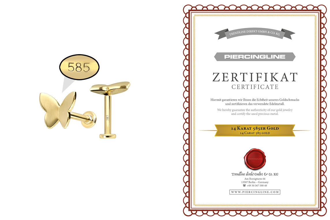 Dieses Labret ist aus hochwertigem 14 Karat (585er) Gold gefertigt, das neben seiner exzellenten Qualität auch mit Eigenschaften wie guter Hautverträglichkeit und hoher Beständigkeit zu begeistern weiß. Farblich ist es in Gelbgold, Roségold und rhodiniertem Weißgold erhältlich. Das Labret verfügt über einen zeitlos schönen Aufsatz mit Titan Push Pin in Form eines Schmetterling, hat eine Stabstärke von entweder 1 oder 1,2 mm und ist in den unten aufgeführten Stablängen erhältlich. Jeder Einzelne unserer Artikel aus Gold wird mit viel Liebe zum Detail in Handarbeit gefertigt und ist somit ein Unikat. Durch die verwendete Push Fit Technologie kann das Labret nach Belieben mit all unseren 14 Karat (585er) Gold Aufsätzen mit Titan Push Pin kombiniert werden.