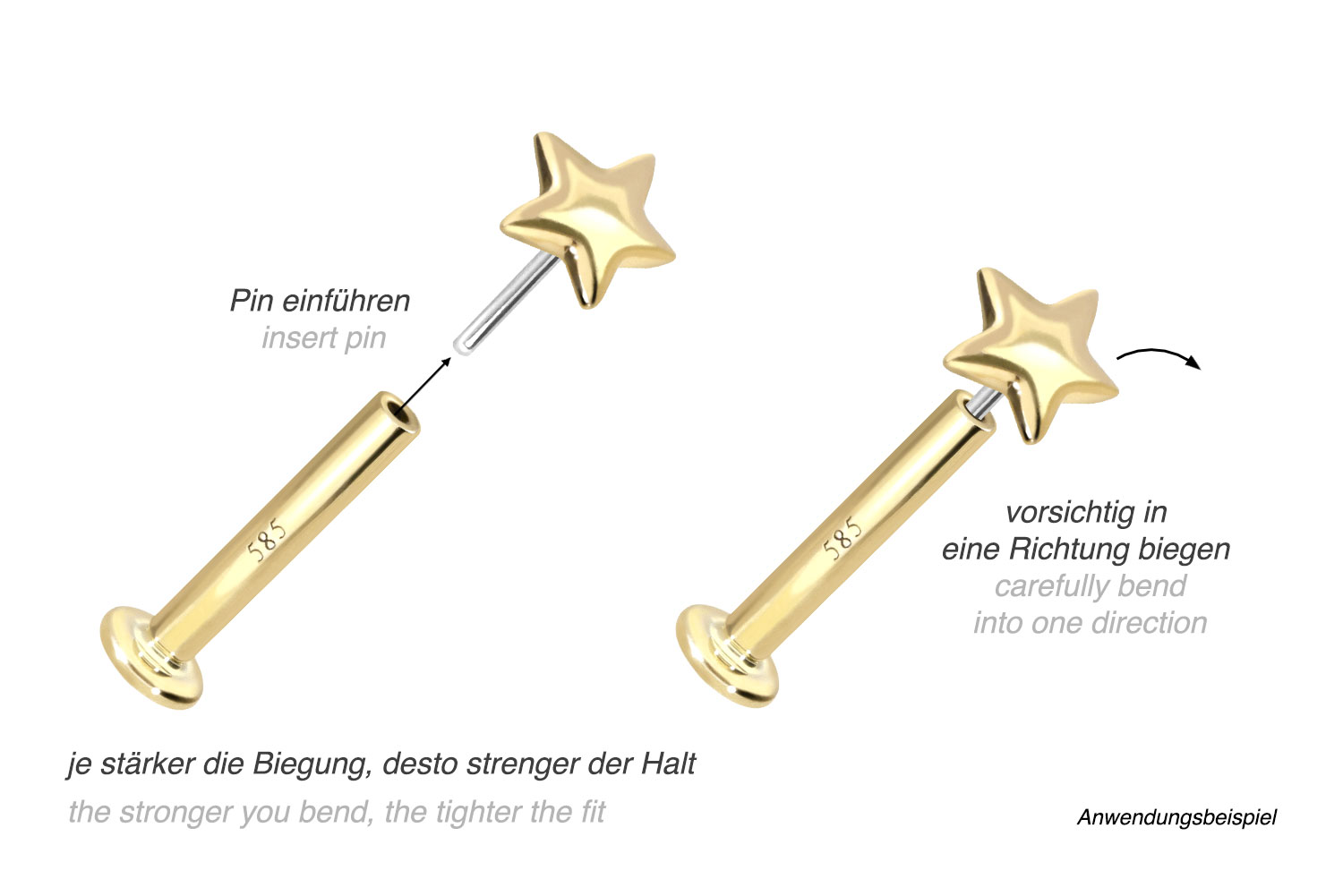 Dieses Labret ist aus hochwertigem 14 Karat (585er) Gold gefertigt, das neben seiner exzellenten Qualität auch mit Eigenschaften wie guter Hautverträglichkeit und hoher Beständigkeit zu begeistern weiß. Farblich ist es in Gelbgold, Roségold und rhodiniertem Weißgold erhältlich. Das Labret verfügt über einen zeitlos schönen Aufsatz mit Titan Push Pin in Form eines Sterns, hat eine Stabstärke von entweder 1 oder 1,2 mm und ist in den unten aufgeführten Stablängen erhältlich. Jeder Einzelne unserer Artikel aus Gold wird mit viel Liebe zum Detail in Handarbeit gefertigt und ist somit ein Unikat. Durch die verwendete Push Fit Technologie kann das Labret nach Belieben mit all unseren Gold Aufsätzen mit Titan Push Pin kombiniert werden.