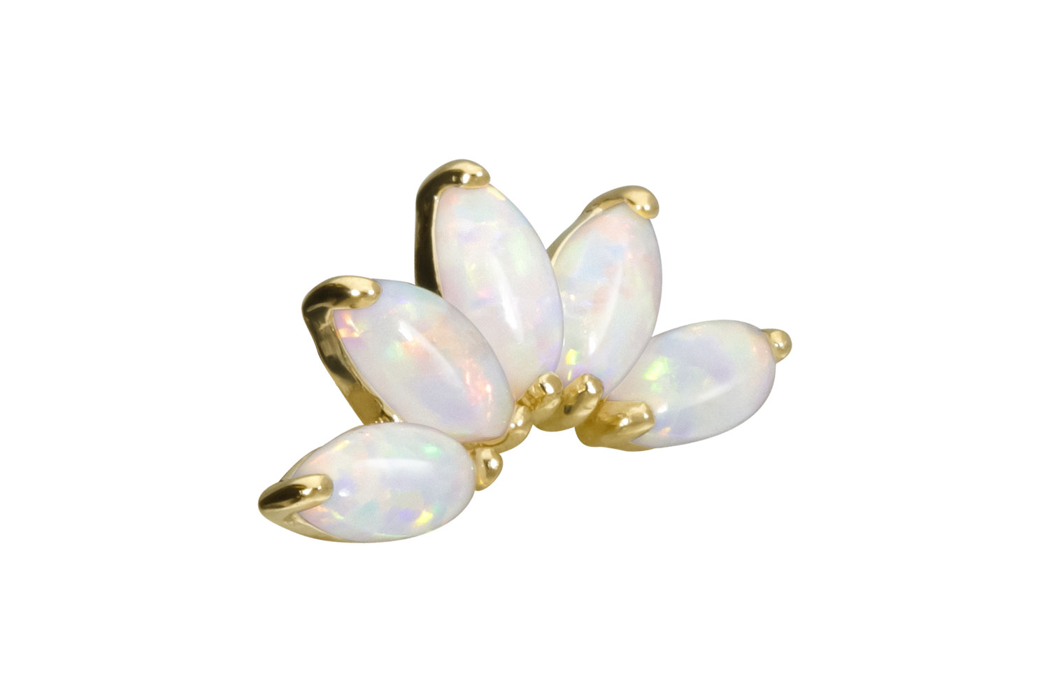 Dieser zeitlos schöne Schraubaufsatz in Form einer Lotusblüte besteht mit Ausnahme der synthetischen Opale vollständig aus hochwertigem 14 Karat (585er) Gold, das neben seiner exzellenten Qualität auch mit Eigenschaften wie guter Hautverträglichkeit und hoher Beständigkeit zu begeistern weiß. Farblich ist er in Gelbgold, Roségold und rhodiniertem Weißgold erhältlich. Jeder Einzelne unserer Artikel aus 14-karätigem Gold wird mit viel Liebe zum Detail in Handarbeit gefertigt und ist somit ein Unikat. Das 0,8 mm starke Außengewinde des Aufsatzes ist mit all unseren 14 Karat (585er) Gold Produkten, die über ein solches Innengewinde verfügen, kompatibel, sodass sich vielfältige Kombinationsmöglichkeiten ergeben.