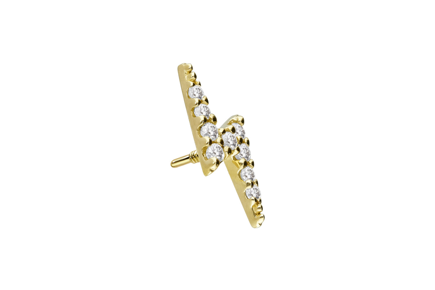 Dieser zeitlos schöne Schraubaufsatz in Form eines Blitzes besteht mit Ausnahme der Moissanite vollständig aus hochwertigem 14 Karat (585er) Gold, das neben seiner exzellenten Qualität auch mit Eigenschaften wie guter Hautverträglichkeit und hoher Beständigkeit zu begeistern weiß. Farblich ist er in Gelbgold, Roségold und rhodiniertem Weißgold erhältlich. Der Moissanit verleiht dem Schmuckstück seinen außergewöhnlichen, diamantenähnlichen Glanz. Jeder Einzelne unserer Artikel aus 14-karätigem Gold wird mit viel Liebe zum Detail in Handarbeit gefertigt und ist somit ein Unikat. Das 0,8 mm starke Außengewinde des Aufsatzes ist mit all unseren 14 Karat (585er) Gold Produkten, die über ein solches Innengewinde verfügen, kompatibel, sodass sich vielfältige Kombinationsmöglichkeiten ergeben.