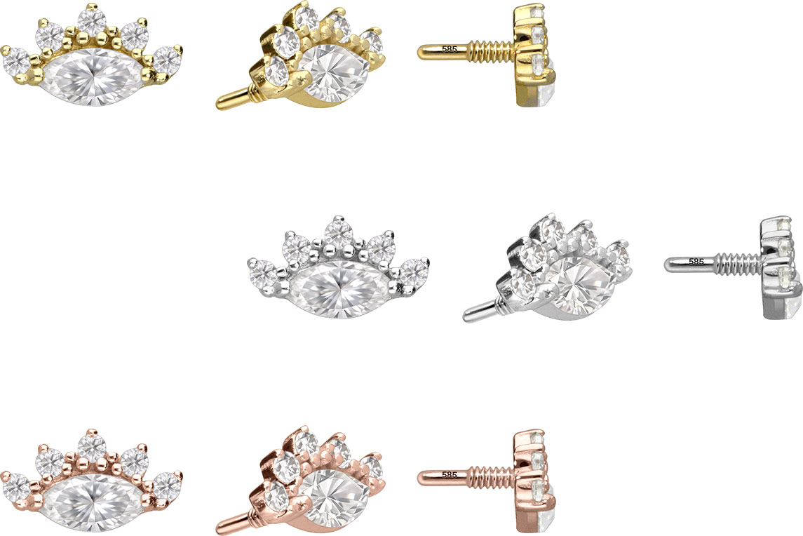 Dieser zeitlos schöne Schraubaufsatz besteht mit Ausnahme der Moissanite vollständig aus hochwertigem 14 Karat (585er) Gold, das neben seiner exzellenten Qualität auch mit Eigenschaften wie guter Hautverträglichkeit und hoher Beständigkeit zu begeistern weiß. Farblich ist er in Gelbgold, Roségold und rhodiniertem Weißgold erhältlich. Der Moissanit verleiht dem Schmuckstück seinen außergewöhnlichen, diamantenähnlichen Glanz. Jeder Einzelne unserer Artikel aus 14-karätigem Gold wird mit viel Liebe zum Detail in Handarbeit gefertigt und ist somit ein Unikat. Das 0,8 mm starke Außengewinde des Aufsatzes ist mit all unseren 14 Karat (585er) Gold Produkten, die über ein solches Innengewinde verfügen, kompatibel, sodass sich vielfältige Kombinationsmöglichkeiten ergeben.