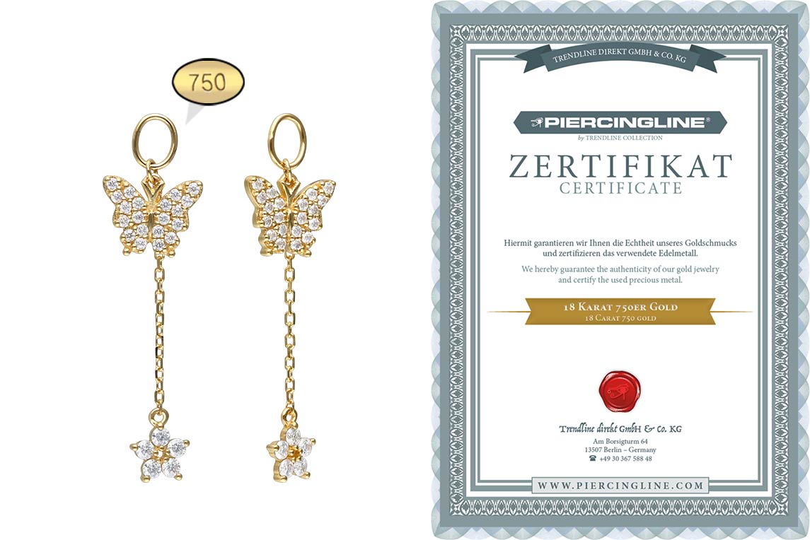 auch individuelle Gestaltung zuteil! Dafür muss der Clicker lediglich geöffnet und das Schmuckstück angebracht werden. Mit Ausnahme der Moissanite besteht der Anhänger vollständig aus hochwertigem 18 Karat (750er) Gelbgold zu dessen Materialeigenschaften unter anderem gute Hautverträglichkeit und hohe Beständigkeit zählen. Der Moissanit verleiht dem Schmuckstück seinen außergewöhnlichen, diamantenähnlichen Glanz. Jeder Einzelne unserer Artikel aus Gold wird mit viel Liebe zum Detail in Handarbeit gefertigt und ist somit ein Unikat. So wird dieser entzückende Anhänger in Form eines Schmetterlings mit einer Blume zu einer hervorragenden Ergänzung für jeden entsprechenden