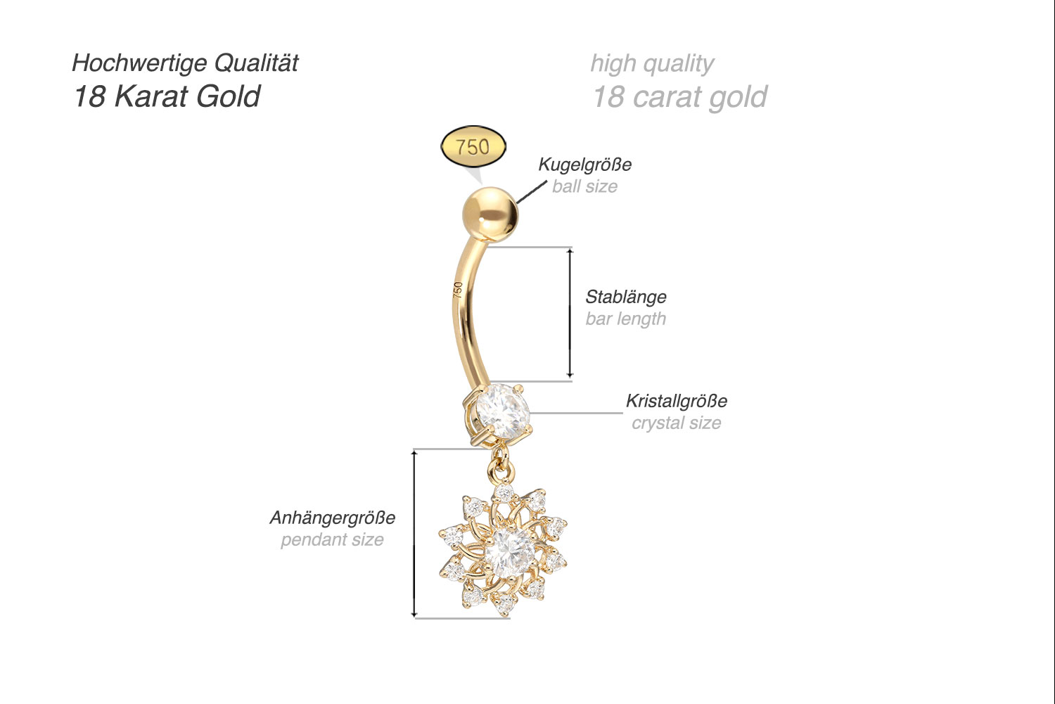 Dieses edle Bananabell besteht mit Ausnahme der Moissanite vollständig aus hochwertigem 18 Karat (750er) Gelbgold, das neben seiner exzellenten Qualität auch mit Eigenschaften wie guter Hautverträglichkeit und hoher Beständigkeit zu begeistern weiß. Der Moissanit verleiht dem Schmuckstück seinen außergewöhnlichen, diamantenähnlichen Glanz. Jeder Einzelne unserer Artikel aus Gold wird mit viel Liebe zum Detail in Handarbeit gefertigt und ist somit ein Unikat. Die Kugel dieses bezaubernden Bananabells kann abgeschraubt werden, während der Moissanit fest mit dem Stab verbunden ist. Ein besonderes Highlight ist der bewegliche Anhänger: eine Blume, die mit vielen funkelnden Moissaniten besetzt ist. Der Stab verfügt über eine Stärke von 1,6 mm sowie einer Länge von 10 mm.