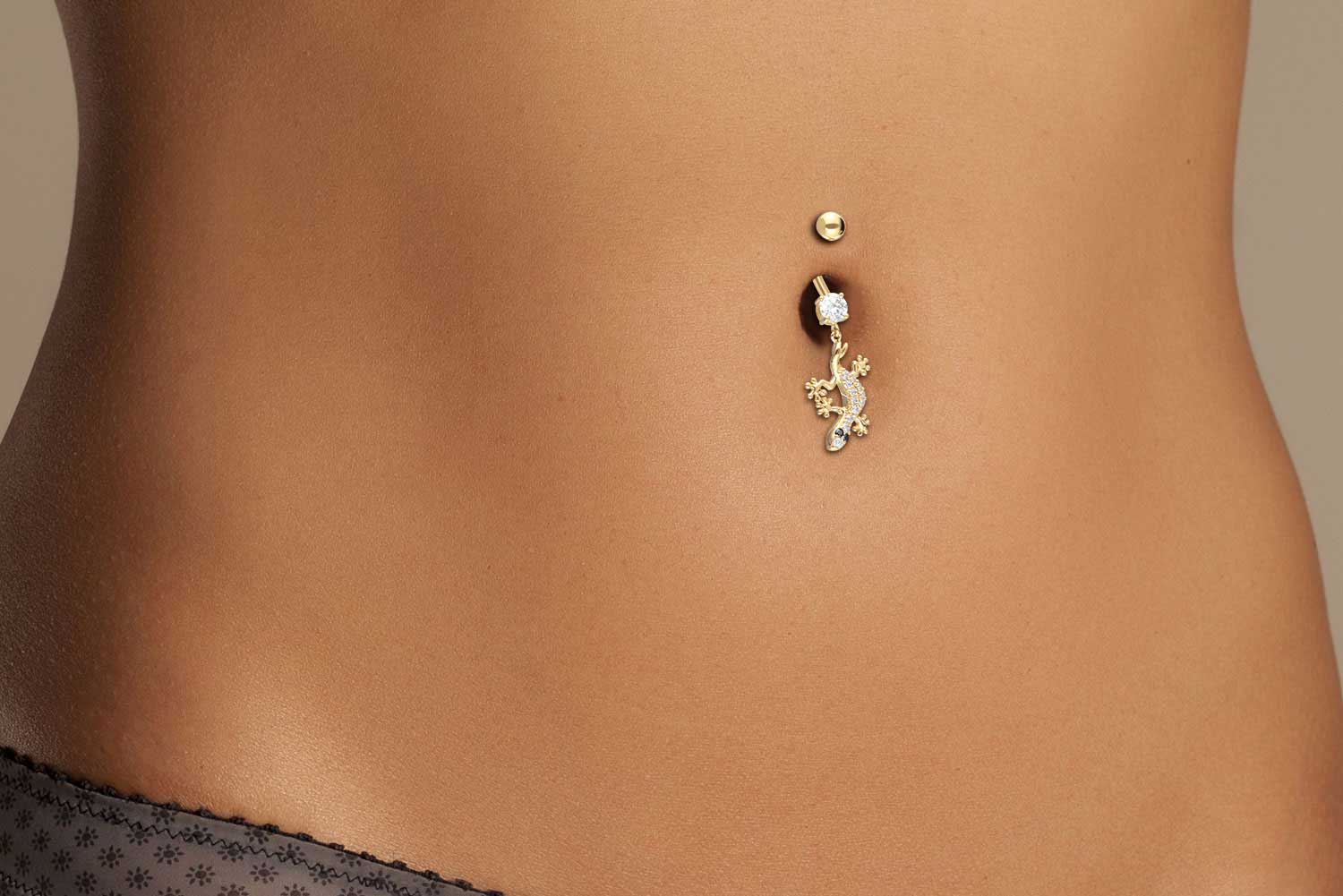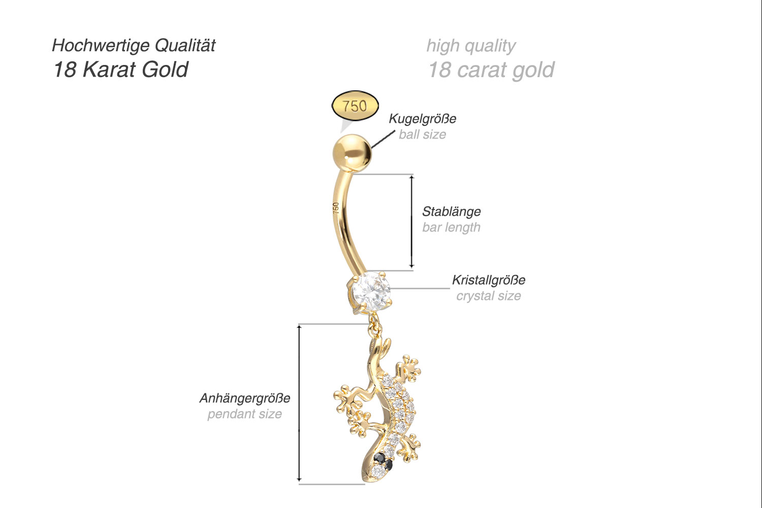 18 Karat Gold - Bauchnabelpiercing eingefasster Moissanit + Gecko