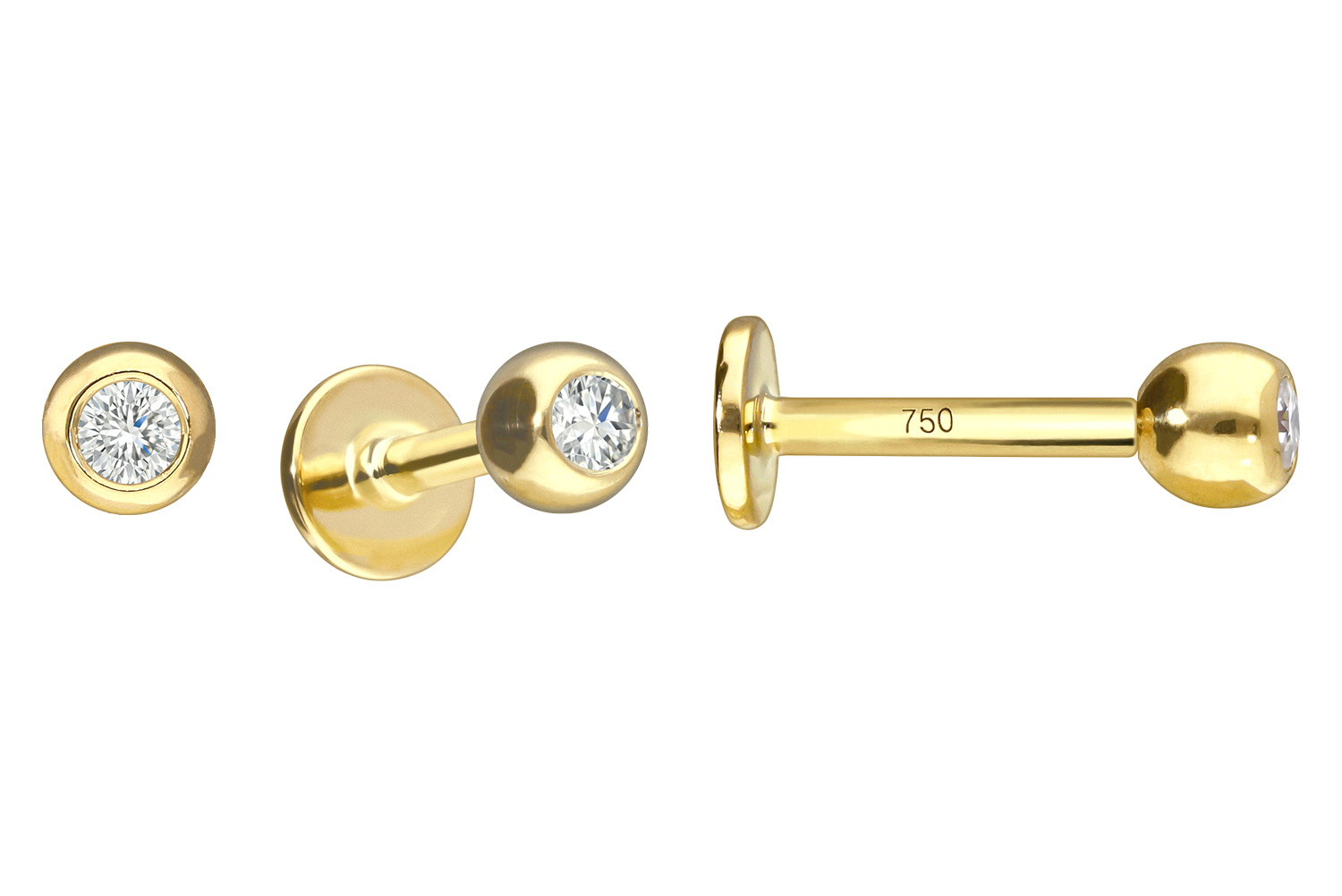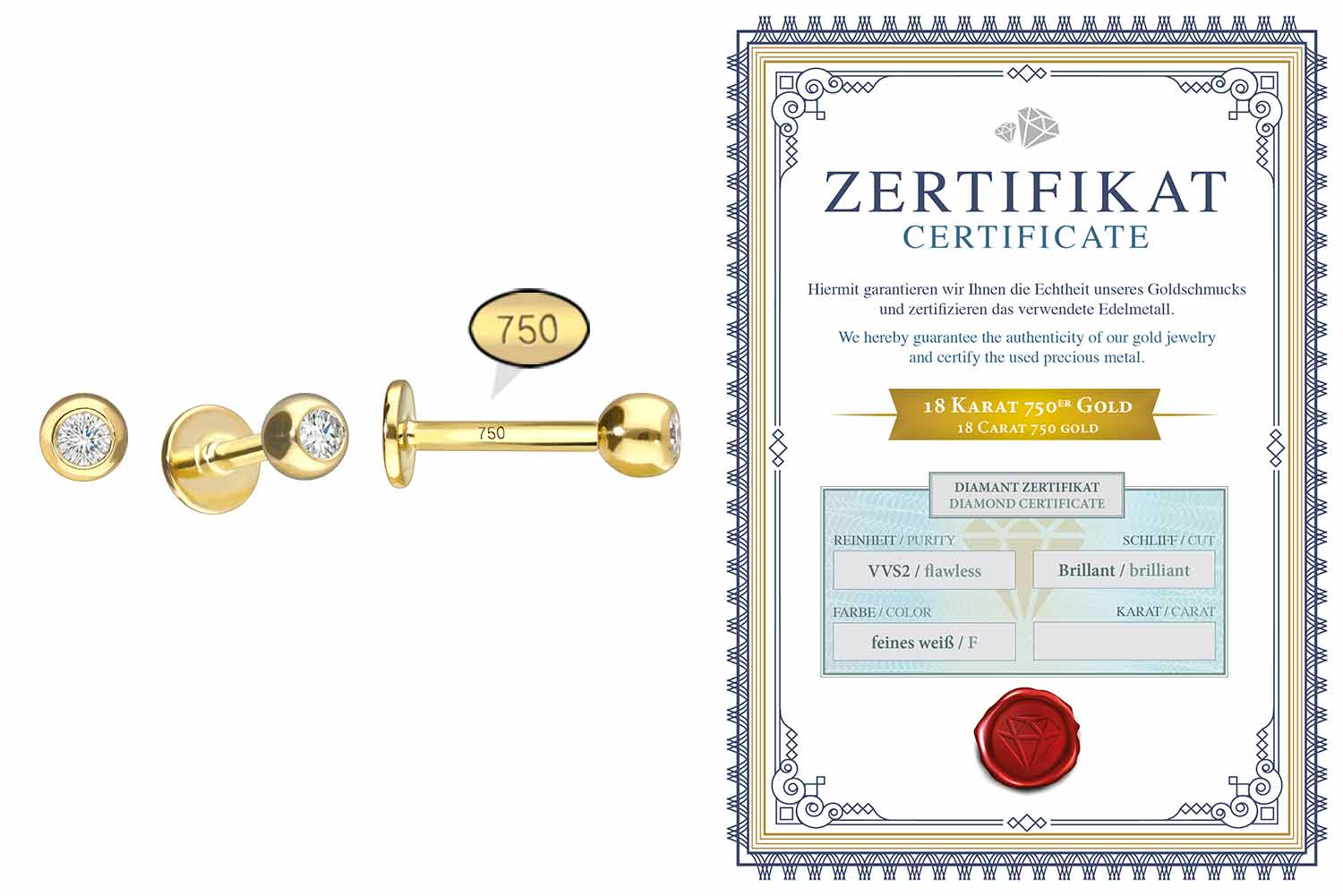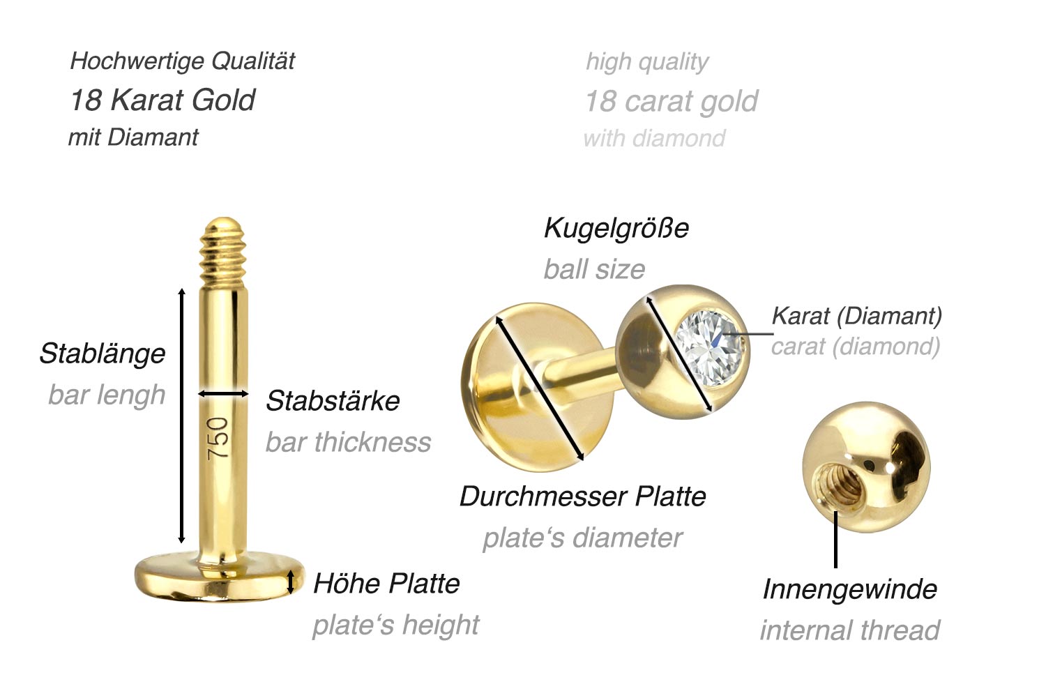 Dieses edle Labret mit 0,025 kt. Diamant besteht vollständig aus hochwertigem 18 Karat (750er) Gelbgold, das neben seiner exzellenten Qualität auch mit Eigenschaften wie guter Hautverträglichkeit und hoher Beständigkeit zu begeistern weiß. Jeder Einzelne unserer Artikel aus Gold wird mit viel Liebe zum Detail in Handarbeit gefertigt und ist somit ein Unikat. Der Stab des Labrets verfügt über eine Stärke von 1,2 mm, wohingegen seine Länge nach Wahl entweder 6, 7 oder 8 mm beträgt. Im Lieferumfang ist ein Echtheitszertifikat für den Diamanten enthalten.