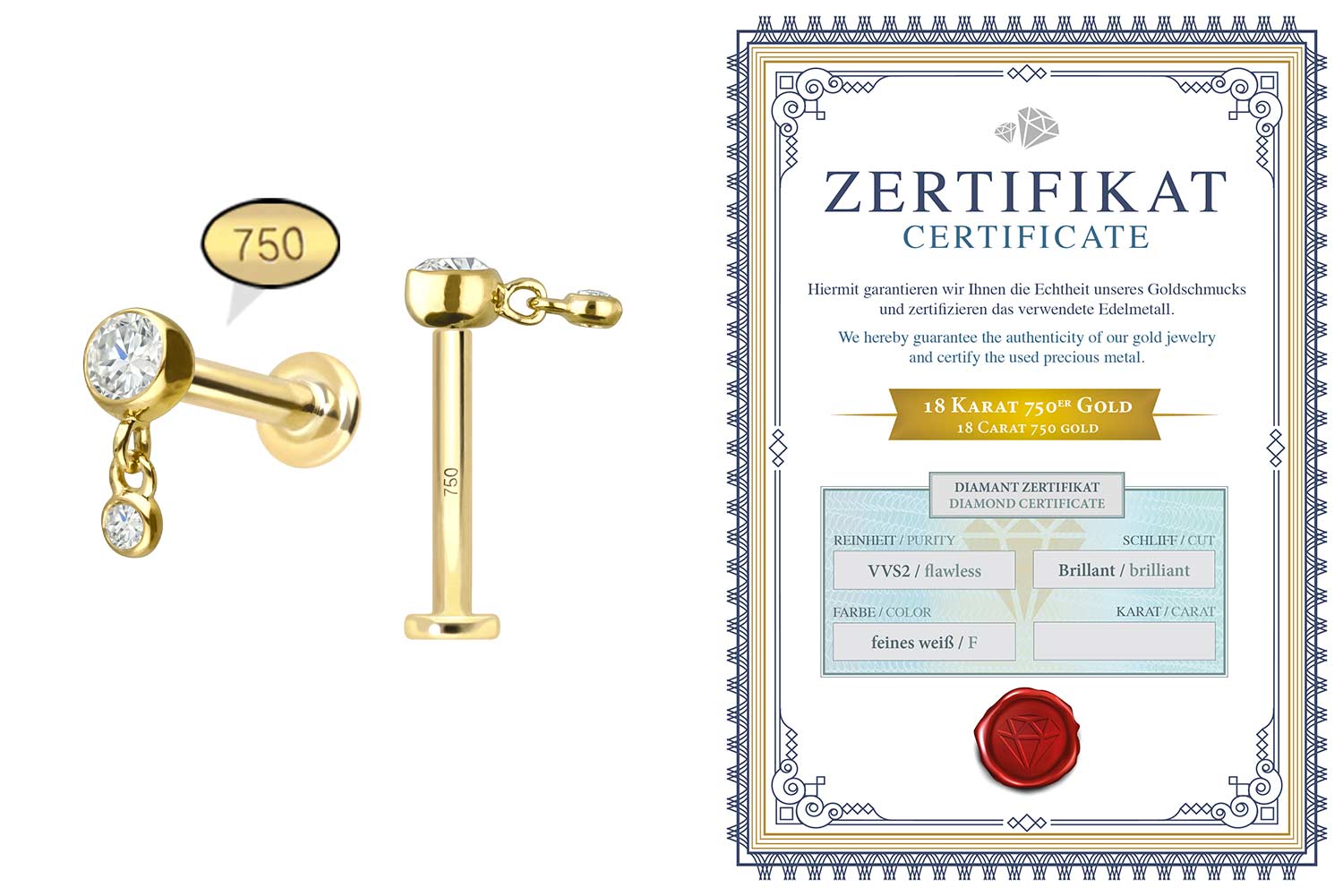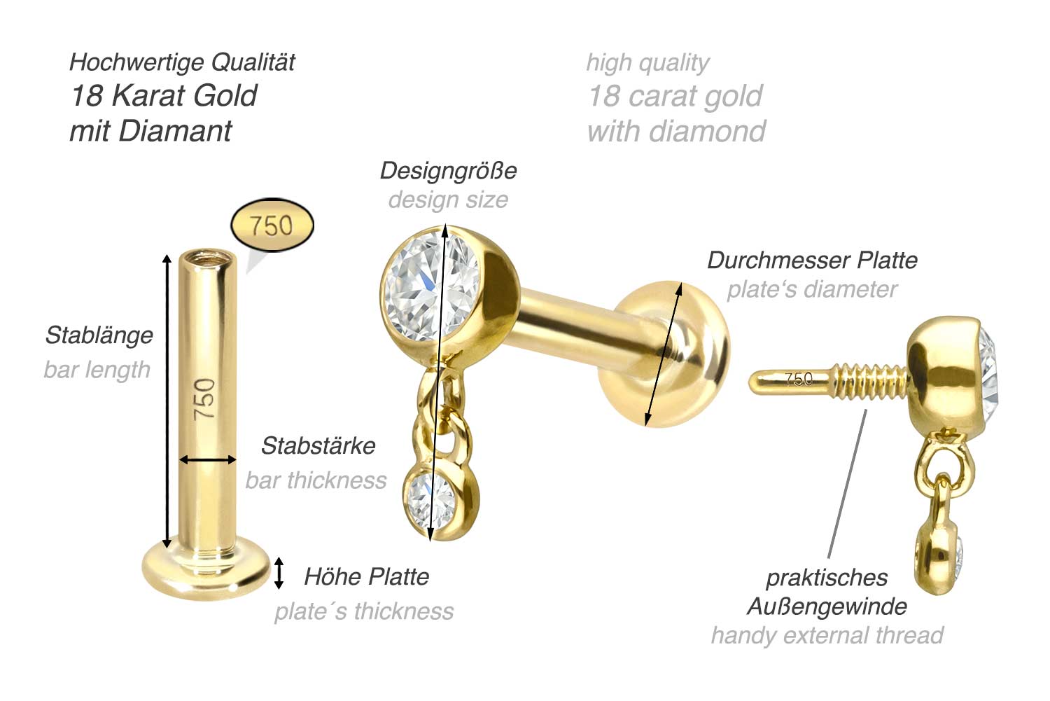 unten aufgeführten Stablängen erhältlich. Der Diamant verleiht dem Schmuckstück seinen außergewöhnlichen Glanz. Jeder Einzelne unserer Artikel aus Gold wird mit viel Liebe zum Detail in Handarbeit gefertigt und ist somit ein Unikat. Das 0,8 mm starke Innengewinde des Labrets ist mit allen Gold Produkten, die über ein solches Außengewinde verfügen, kompatibel, sodass sich vielfältige Kombinationsmöglichkeiten ergeben. Zusätzlich ist im Lieferumfang ein Echtheitszertifikat für den Diamanten enthalten.