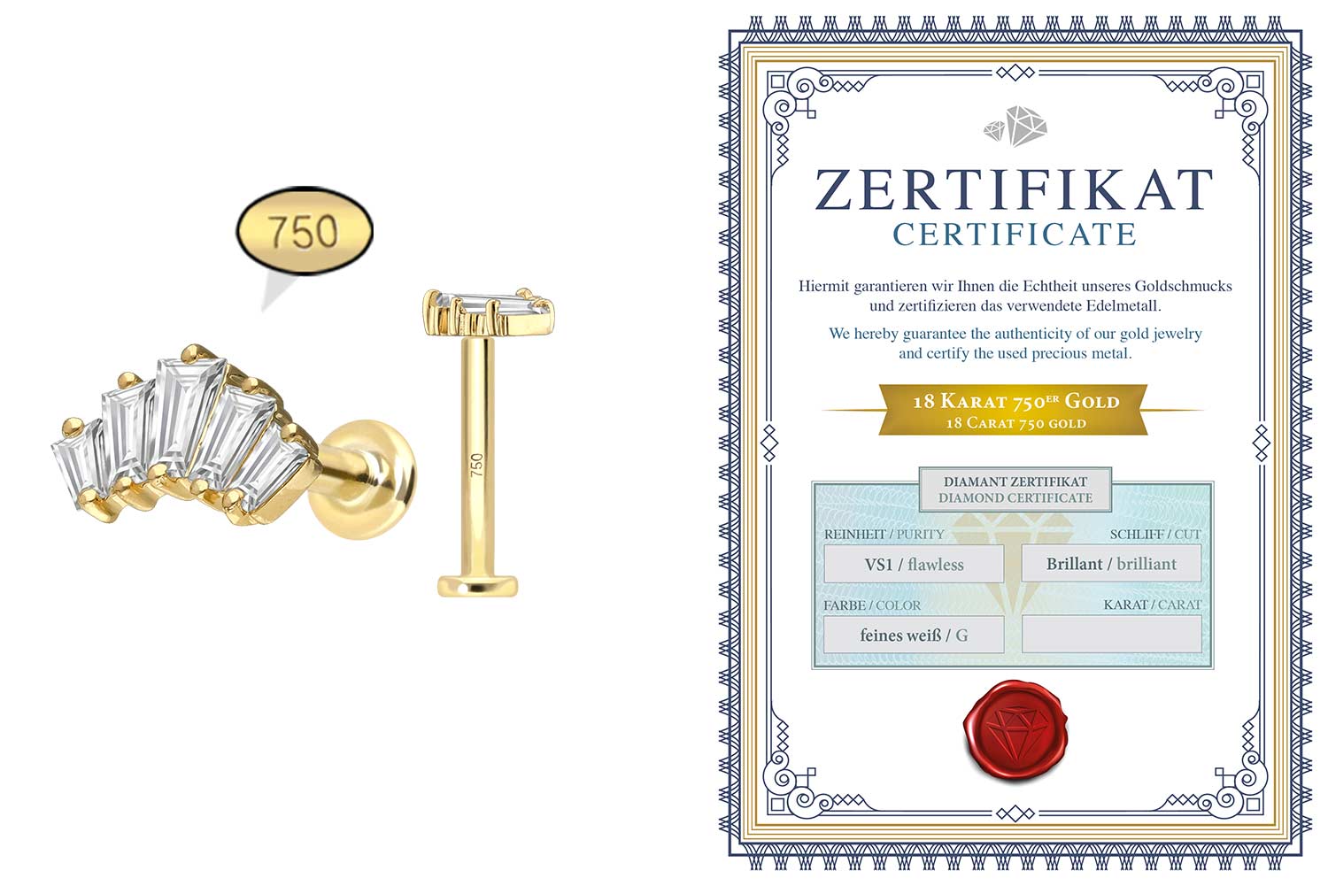 unten aufgeführten Stablängen erhältlich. Der Diamant verleiht dem Schmuckstück seinen außergewöhnlichen Glanz. Jeder Einzelne unserer Artikel aus Gold wird mit viel Liebe zum Detail in Handarbeit gefertigt und ist somit ein Unikat. Das 0,8 mm starke Innengewinde des Labrets ist mit allen Gold Produkten, die über ein solches Außengewinde verfügen, kompatibel, sodass sich vielfältige Kombinationsmöglichkeiten ergeben. Zusätzlich ist im Lieferumfang ein Echtheitszertifikat für den Diamanten enthalten.