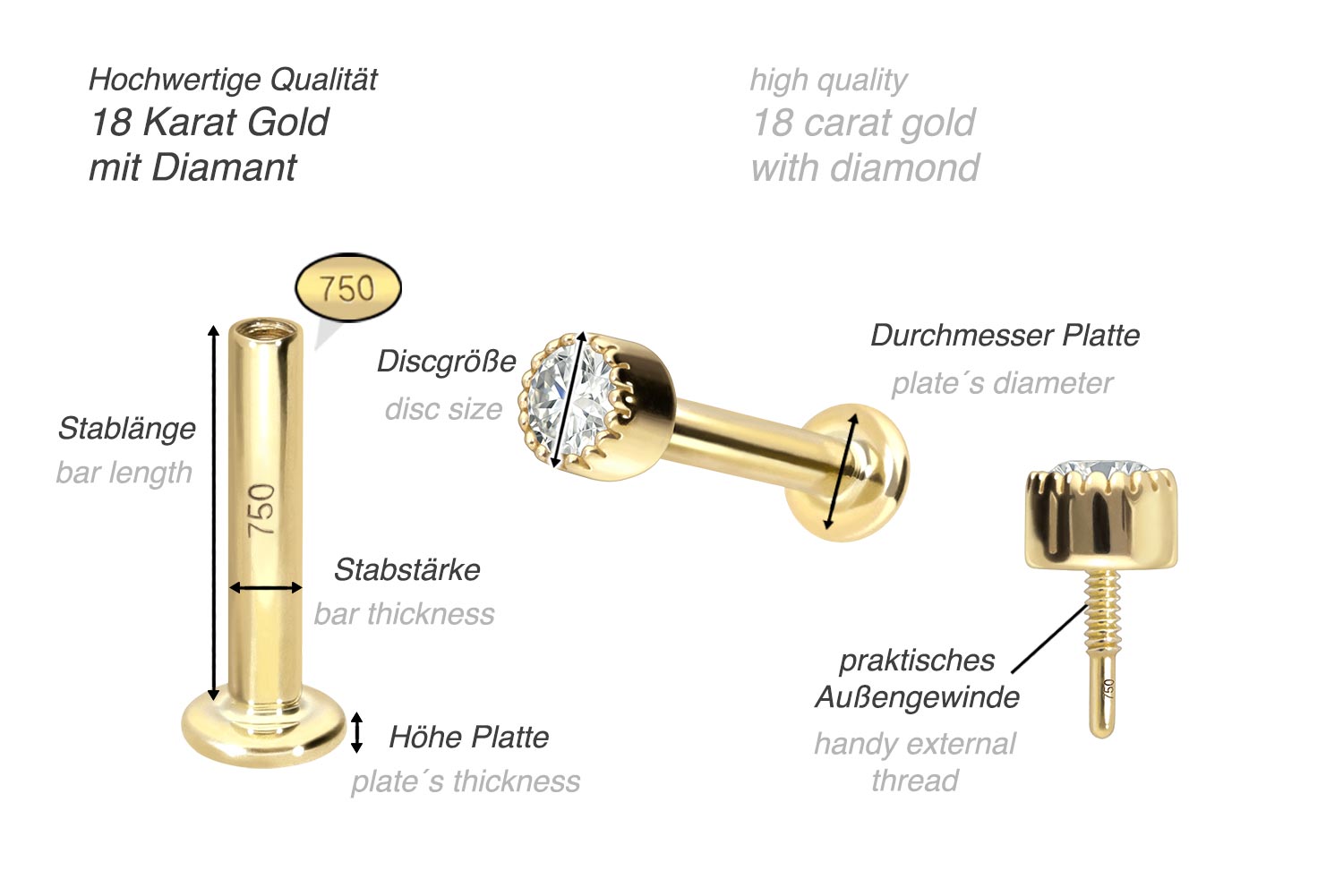 18 Karat Gold Labret mit Innengewinde DIAMANT-DISC