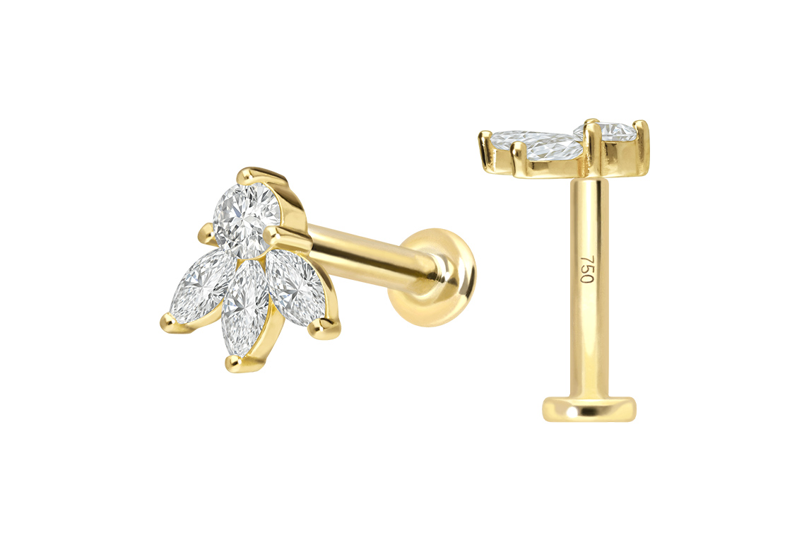Dieses Labret ist mit Ausnahme der lupenreinen Diamanten vollständig aus hochwertigem 18 Karat (750er) Gelbgold gefertigt, das neben seiner exzellenten Qualität auch mit Eigenschaften wie guter Hautverträglichkeit und hoher Beständigkeit zu begeistern weiß. Das Labret verfügt über einen zeitlos schönen Schraubaufsatz mit Außengewinde in Form einer Lotusblüte, hat