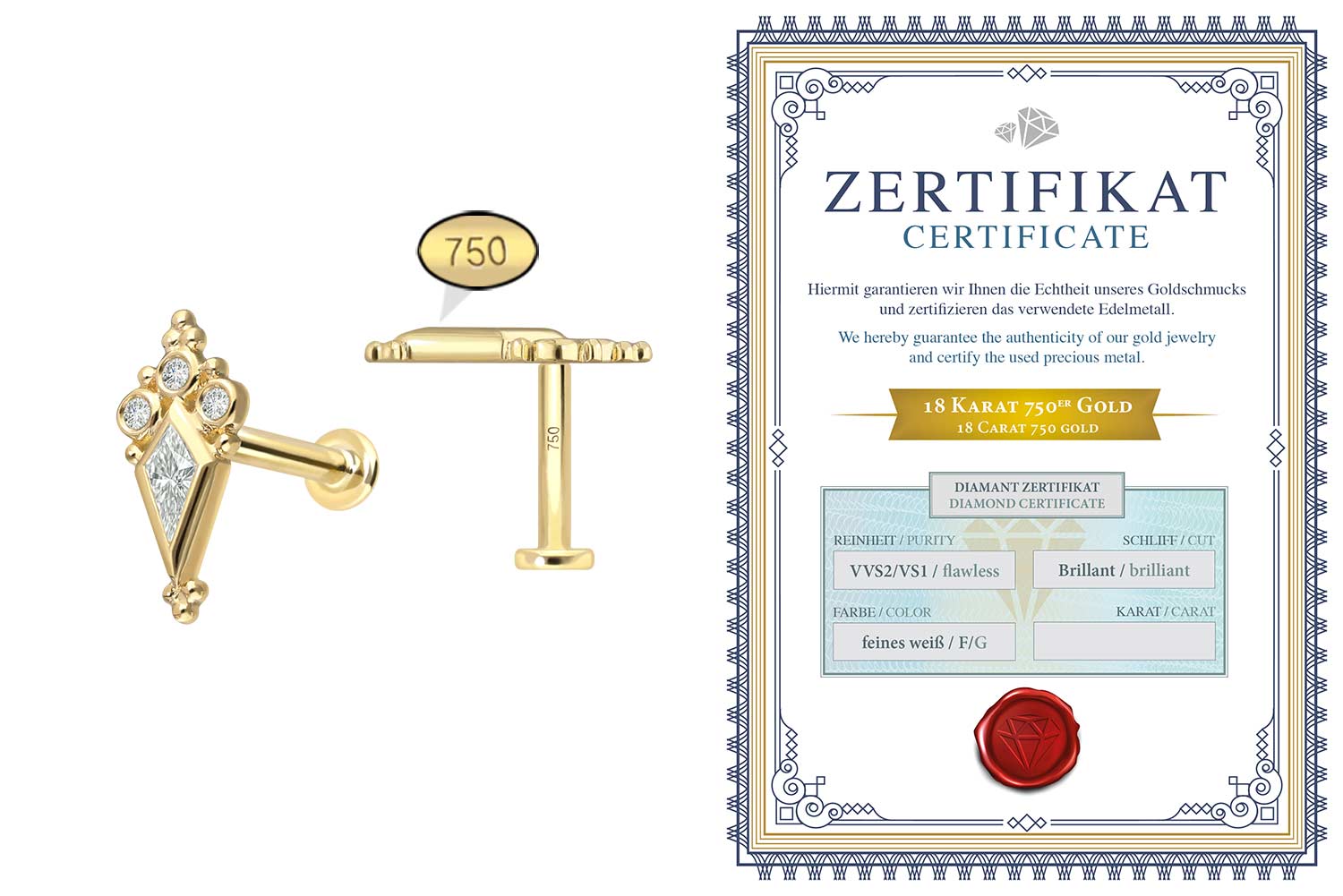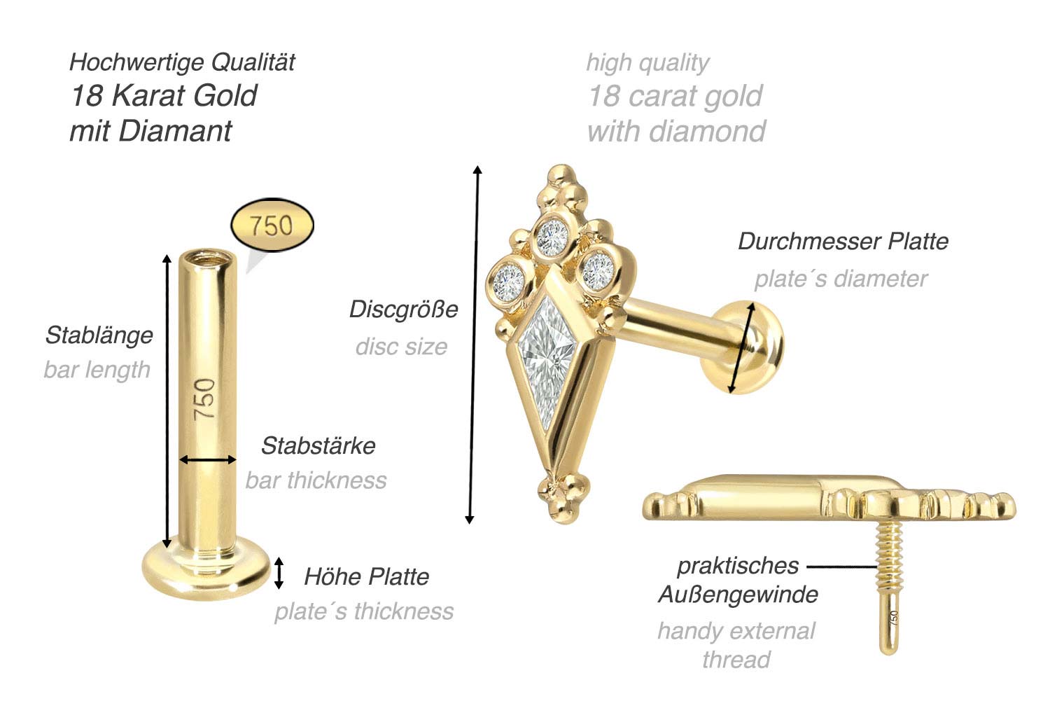 unten aufgeführten Stablängen erhältlich. Der Diamant verleiht dem Schmuckstück seinen außergewöhnlichen Glanz. Jeder Einzelne unserer Artikel aus Gold wird mit viel Liebe zum Detail in Handarbeit gefertigt und ist somit ein Unikat. Das 0,8 mm starke Innengewinde des Labrets ist mit allen Gold Produkten, die über ein solches Außengewinde verfügen, kompatibel, sodass sich vielfältige Kombinationsmöglichkeiten ergeben. Zusätzlich ist im Lieferumfang ein Echtheitszertifikat für den Diamanten enthalten.