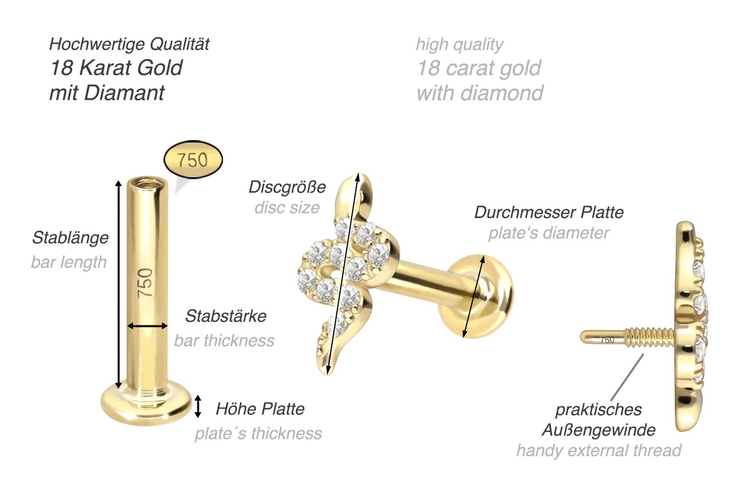 unten aufgeführten Stablängen erhältlich. Der Diamant verleiht dem Schmuckstück seinen außergewöhnlichen Glanz. Jeder Einzelne unserer Artikel aus Gold wird mit viel Liebe zum Detail in Handarbeit gefertigt und ist somit ein Unikat. Das 0,8 mm starke Innengewinde des Labrets ist mit allen Gold Produkten, die über ein solches Außengewinde verfügen, kompatibel, sodass sich vielfältige Kombinationsmöglichkeiten ergeben. Zusätzlich ist im Lieferumfang ein Echtheitszertifikat für den Diamanten enthalten.