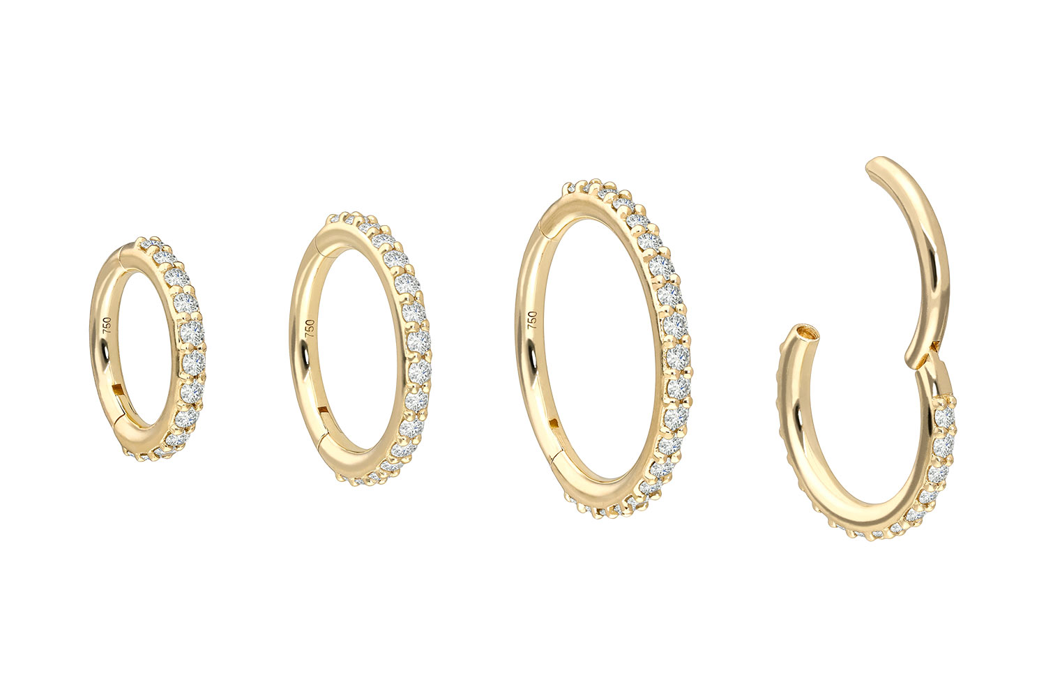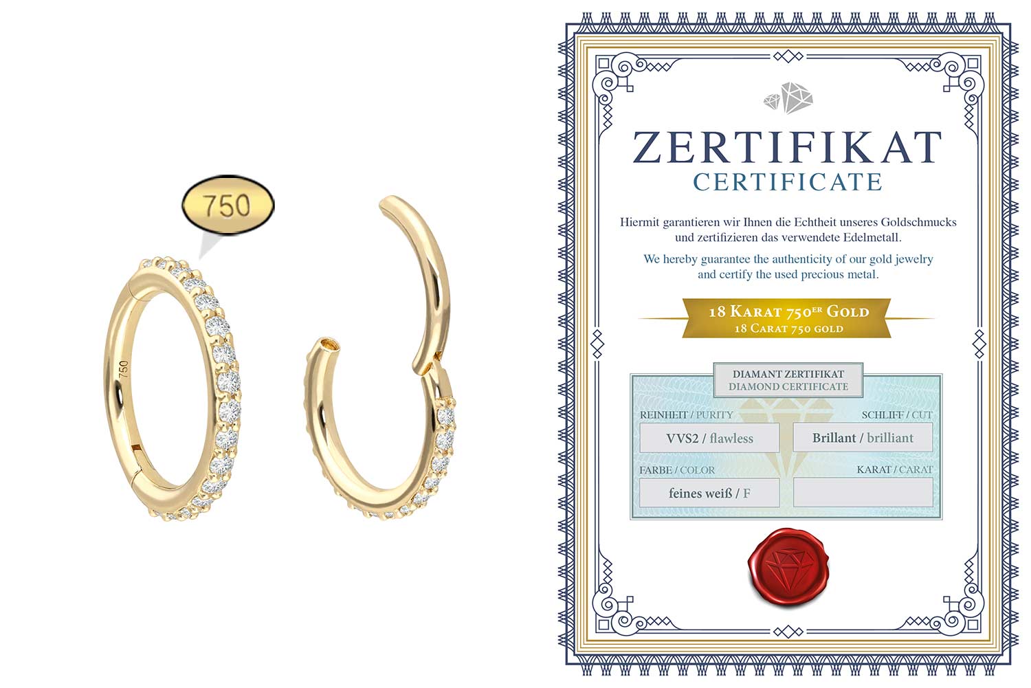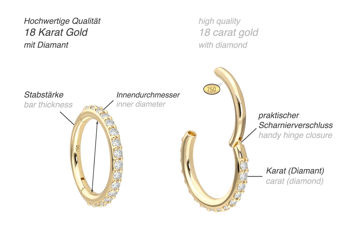 Einfache Handhabung und schönes Design - das sind unsere Clicker! Als Hauptmerkmal der Clicker zählt das praktische Scharnier, das den Einsatz in den Stichkanal enorm erleichtert. Diese edle Schmuckstück besteht mit Ausnahme der Diamanten vollständig aus hochwertigem 18 Karat (750er) Gelbgold, das neben seiner exzellenten Qualität auch mit Eigenschaften wie guter Hautverträglichkeit und hoher Beständigkeit zu begeistern weiß. Der Diamant verleiht dem Schmuckstück seinen außergewöhnlichen Glanz. Jeder Einzelne unserer Artikel aus Gold wird mit viel Liebe zum Detail in Handarbeit gefertigt und ist somit ein Unikat. Ob am Ohr, der Nase, oder der Lippe – unsere Clicker sind für die verschiedensten Piercingstellen geeignet. Dieser Clicker hat eine Stabstärke von 1,2 mm und ist in den unten aufgeführten Innendurchmessern erhältlich. Im Lieferumfang enthalten ist ein Echtheitszertifikat für die Diamanten.