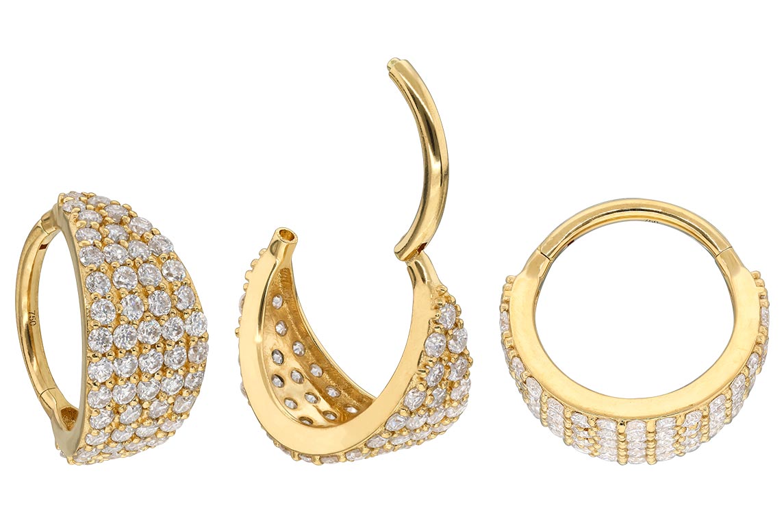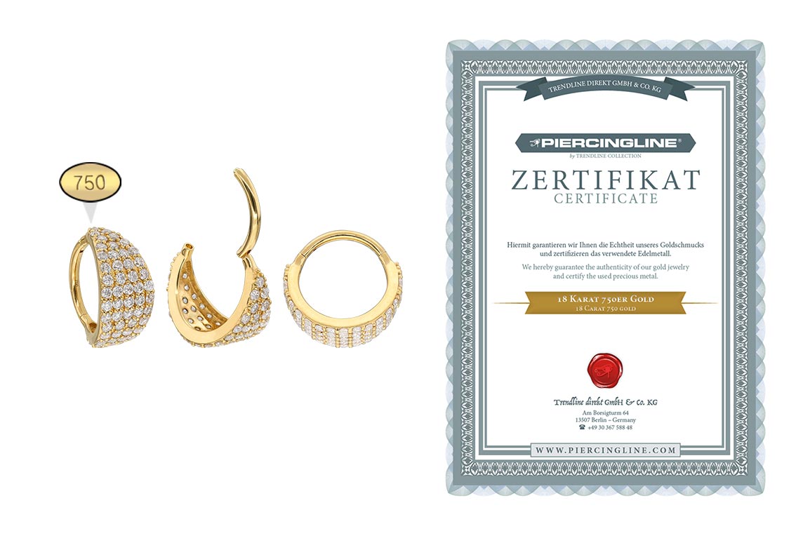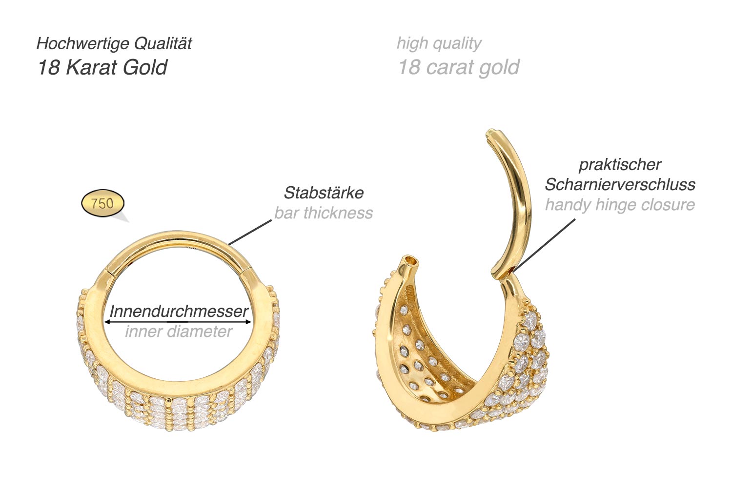 Einfache Handhabung und schönes Design - das sind unsere Clicker! Als Hauptmerkmal der Clicker zählt das praktische Scharnier, das den Einsatz in den Stichkanal enorm erleichtert. Diese edle Schmuckstück besteht mit Ausnahme der Moissanite vollständig aus hochwertigem 18 Karat (750er) Gelbgold, das neben seiner exzellenten Qualität auch mit Eigenschaften wie guter Hautverträglichkeit und hoher Beständigkeit zu begeistern weiß. Der Moissanit verleiht dem Schmuckstück seinen außergewöhnlichen, diamantenähnlichen Glanz. Jeder Einzelne unserer Artikel aus Gold wird mit viel Liebe zum Detail in Handarbeit gefertigt und ist somit ein Unikat. Als Highlight ziert den stilvollen Clicker ein funkelndes Moissanit-Schild Ob am Ohr, der Nase, oder der Lippe - unsere Clicker sind für die verschiedensten Piercingstellen geeignet. Dieser Clicker ist mit einer Stabstärke von 1,2 mm in den unten aufgeführten Innendurchmessern erhältlich.