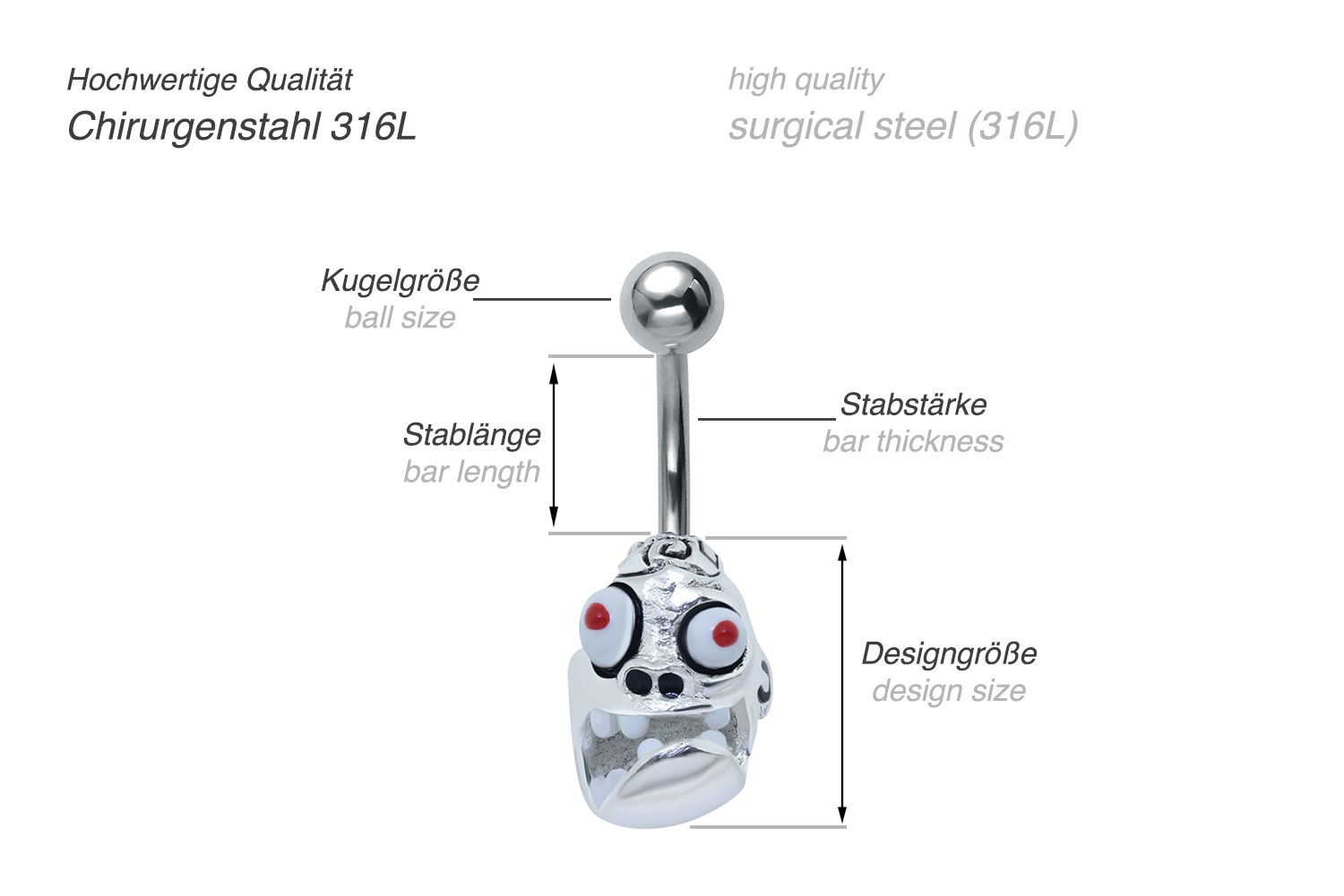 Bei diesem Bauchnabelpiercing bestehen der Stab und die abschraubbare 5 mm Kugel aus hochwertigem Chirurgenstahl 316L. Das Motiv in Form von Bubba J. ist aus Messing gefertigt und zusätzlich versilbert. Das Motiv ist fest an der Banane angebracht. Das verwendete Stabmaterial (Chirurgenstahl 316L) zeichnet sich durch seine besonderen Eigenschaften wie Farbechtheit und Beständigkeit aus. Alle Bauchnabelpiercings aus unserer BSB-Serie sind mit einer 1,6 mm Stabstärke und einer 10 mm Stablänge erhältlich. Das 1,6 mm Gewinde dieses Bauchnabelpiercings lässt sich vielseitig mit unserem Schraubzubehör kombinieren.