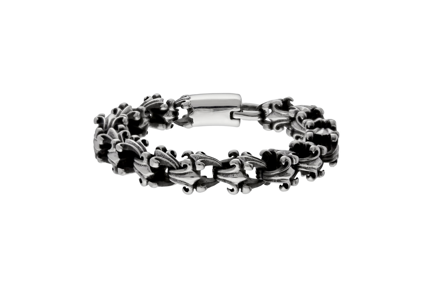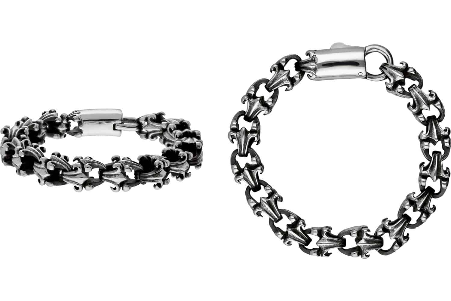 Eigenschaften auch durch Formstabilität und hohe Kratz- und Korrosionsbeständigkeit auszeichnet. Visuell überzeugt das Schmuckstück mithilfe seines originellen Designs in Form von aneinandergereihten, plastisch ausgearbeiteten Lilien.