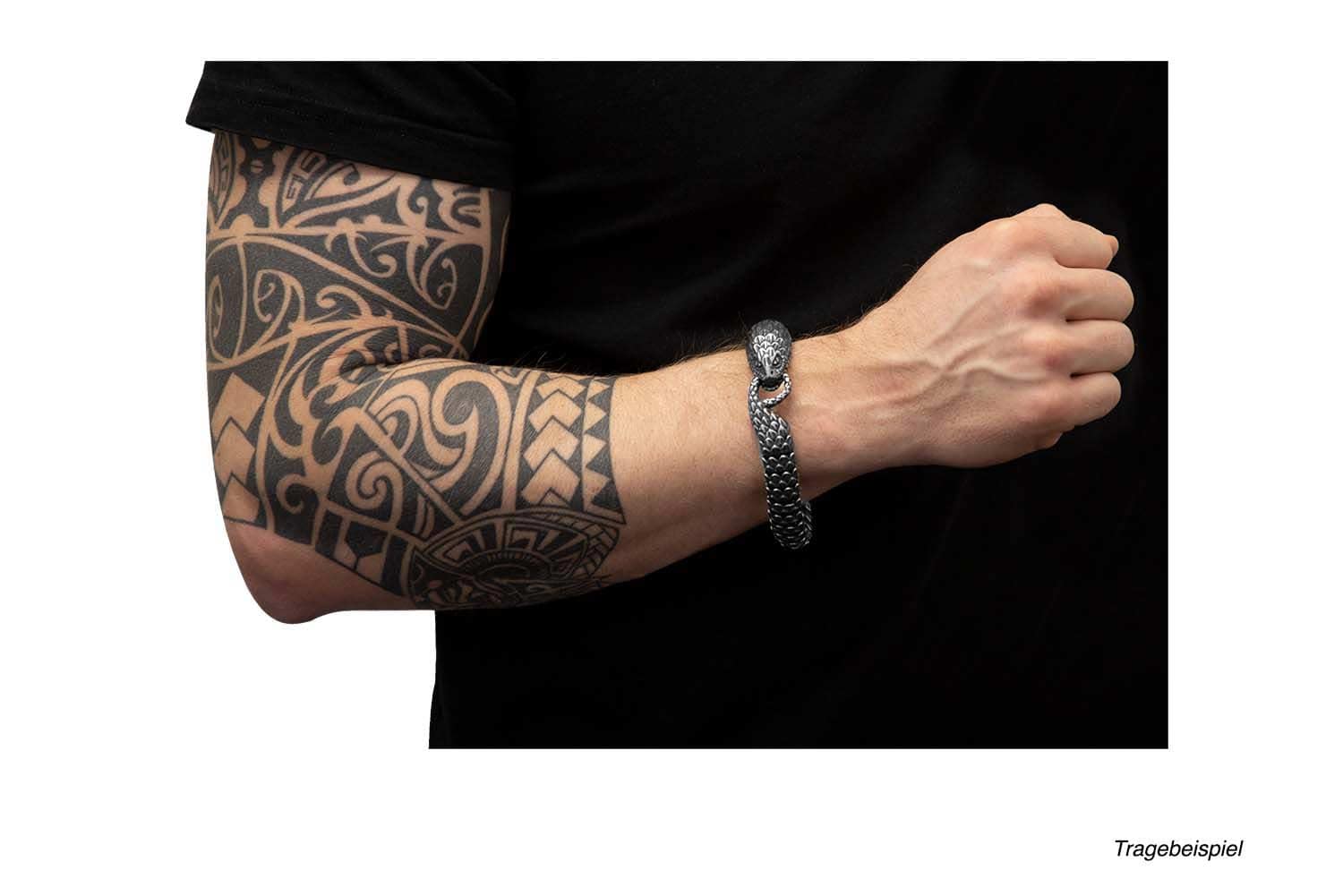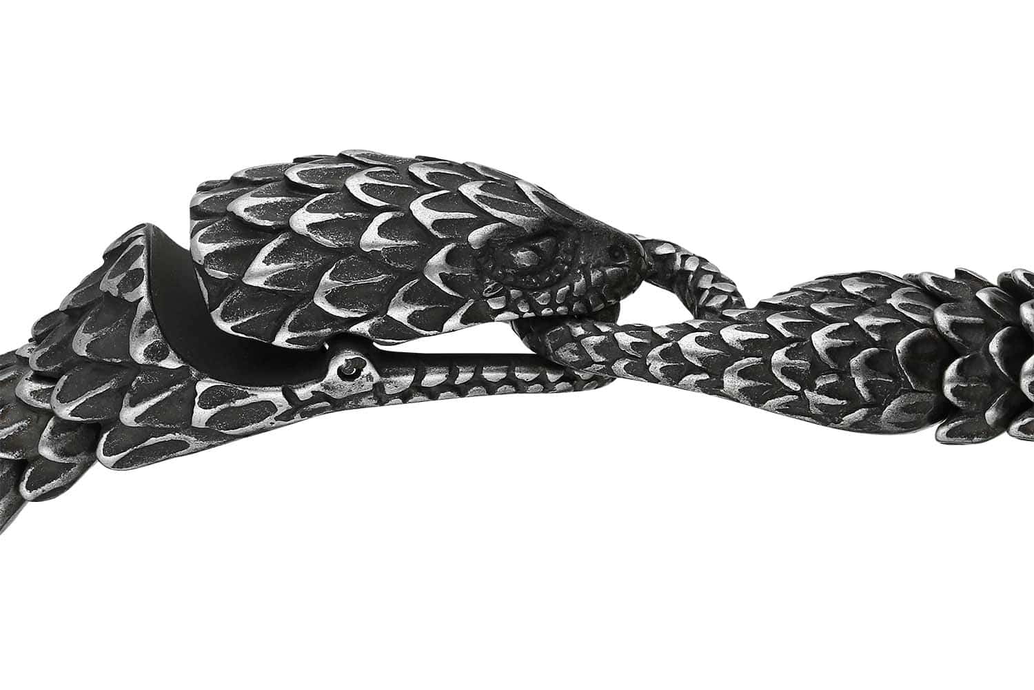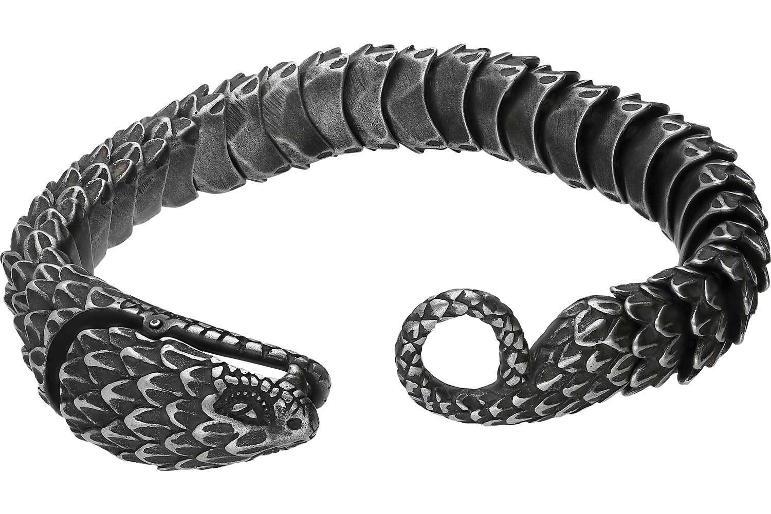 Ein extravagantes Armband, bestehend aus hochwertigem Chirurgenstahl 316L, der sich neben weiteren positiven Eigenschaften auch durch Formstabilität und hohe Kratz- und Korrosionsbeständigkeit auszeichnet. Visuell überzeugt das Schmuckstück mithilfe seines originellen Designs in Form einer Schlange.