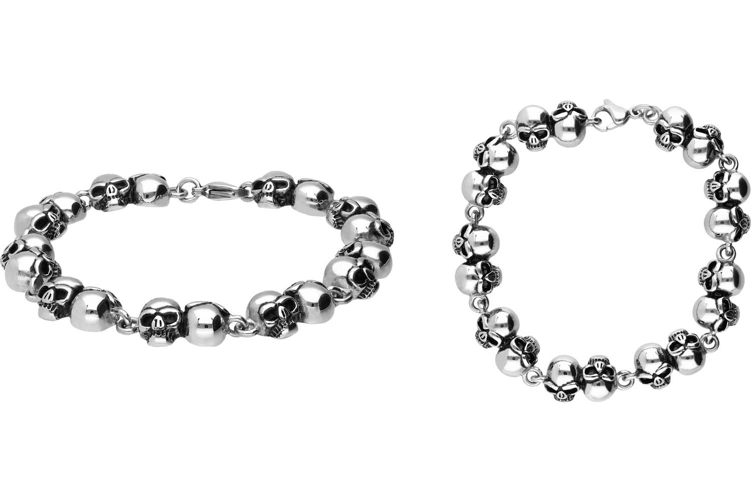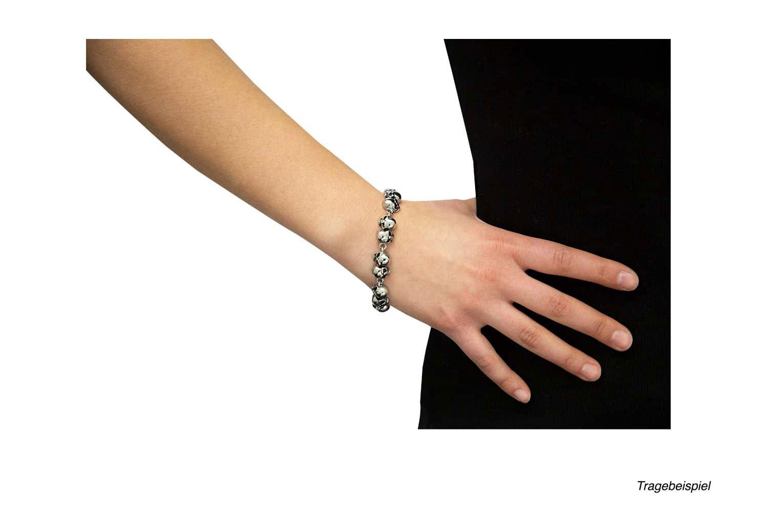 Eigenschaften auch durch Formstabilität und hohe Kratz- und Korrosionsbeständigkeit auszeichnet. Visuell überzeugt das Schmuckstück mithilfe seines originellen Designs in Form von einigen Totenköpfen, die sich in Paaren aneinanderreihen.