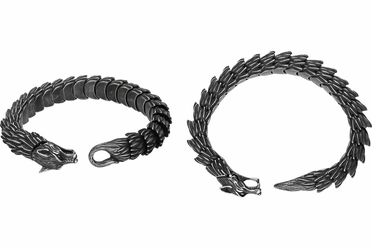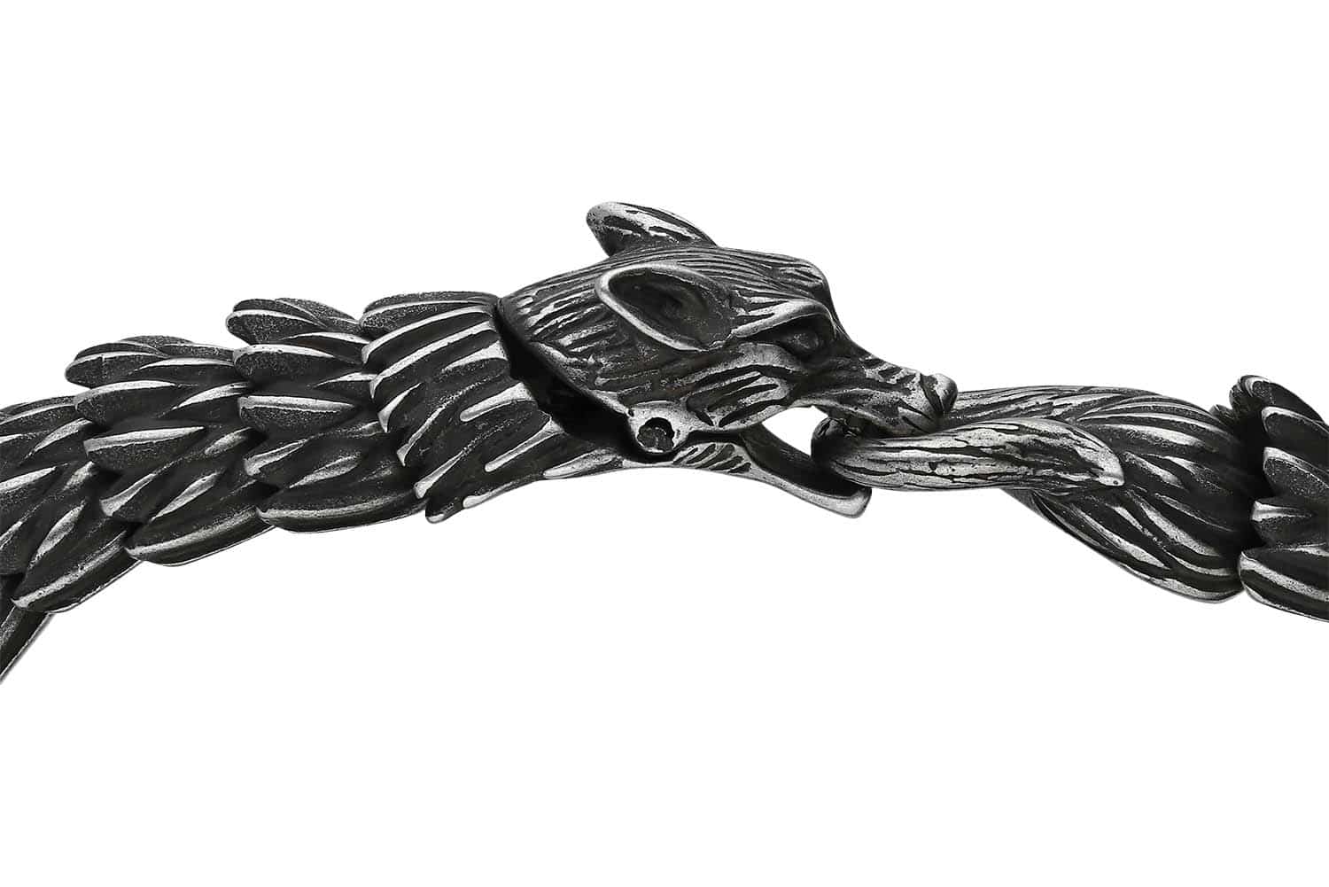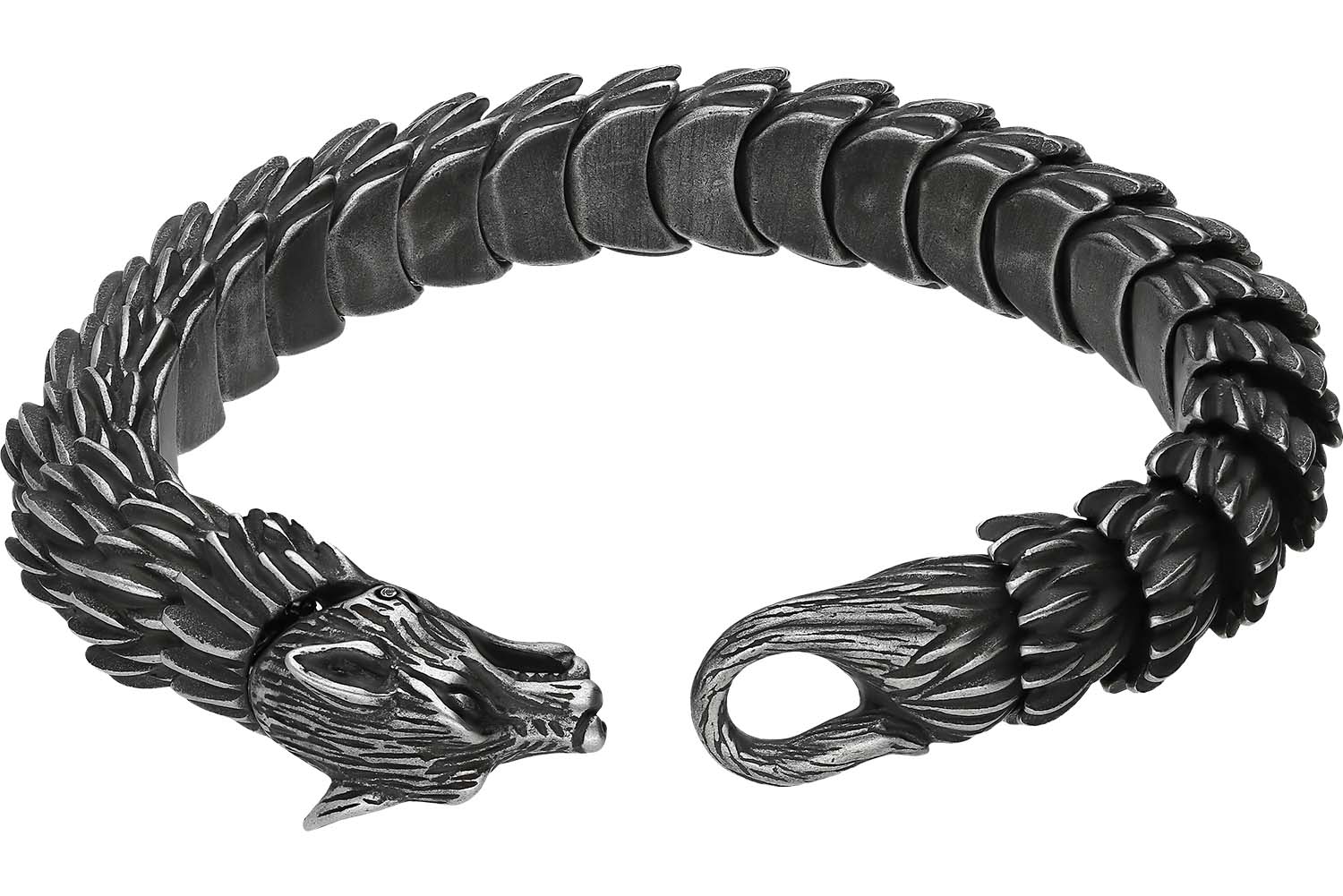 Eigenschaften auch durch Formstabilität und hohe Kratz- und Korrosionsbeständigkeit auszeichnet. Visuell überzeugt das Schmuckstück mithilfe seines originellen Designs in Form eines Wolfs.