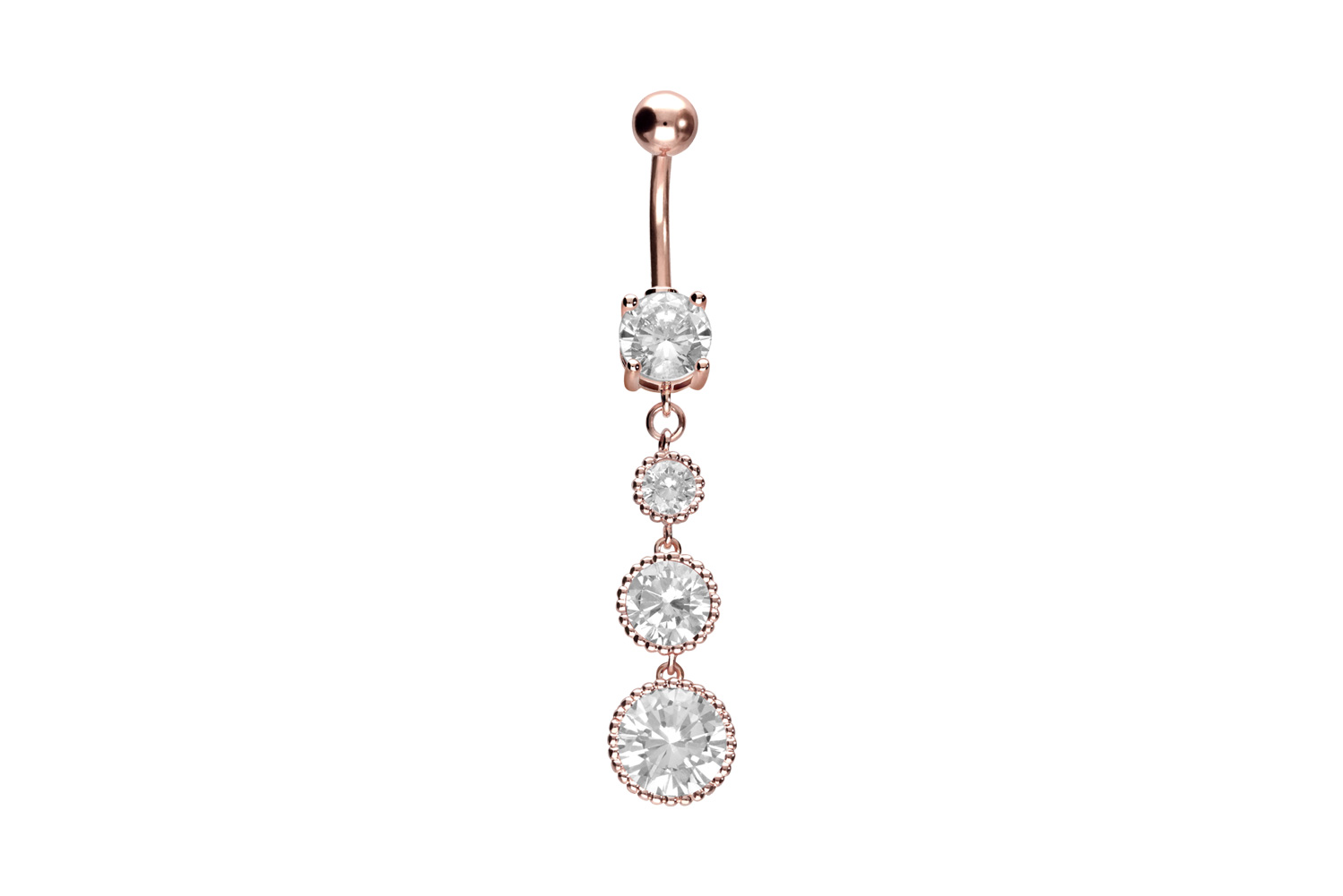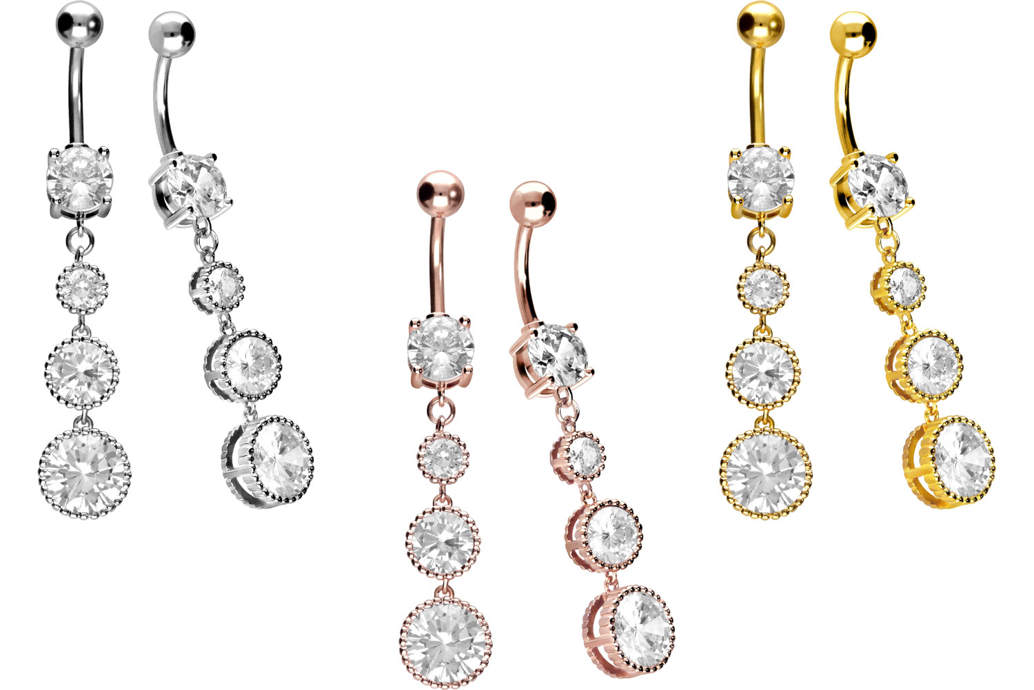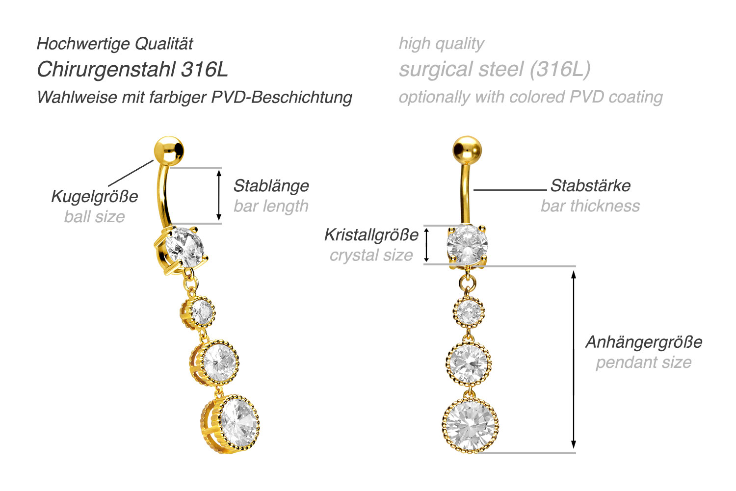 Dieses edle Bananabell ist aus hochwertigem Chirurgenstahl 316L gefertigt, der je nach gewünschter Farbe mit einer kratzfesten PVD-Beschichtung versehen ist. Zu den Materialeigenschaften von Chirurgenstahl 316L gehören neben hoher Qualität auch ebene Beschaffenheit sowie hohe Beständigkeit. Die obere Kugel kann abgeschraubt werden, während der untere Kristall mit Fassung fest mit dem Bananabell verbunden ist. Ein besonderes Highlight sind die wertvollen Anhänger: drei unterschiedlich große Kristalle, die miteinander um die Wette funkeln. Sowohl die Fassung des obersten Kristalls als auch die Anhänger sind aus Messing hergestellt. Das Bauchnabelpiercing hat eine Stabstärke von 1,6 mm und ist mit einer Stablänge von 10 mm erhältlich.